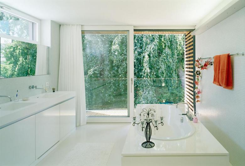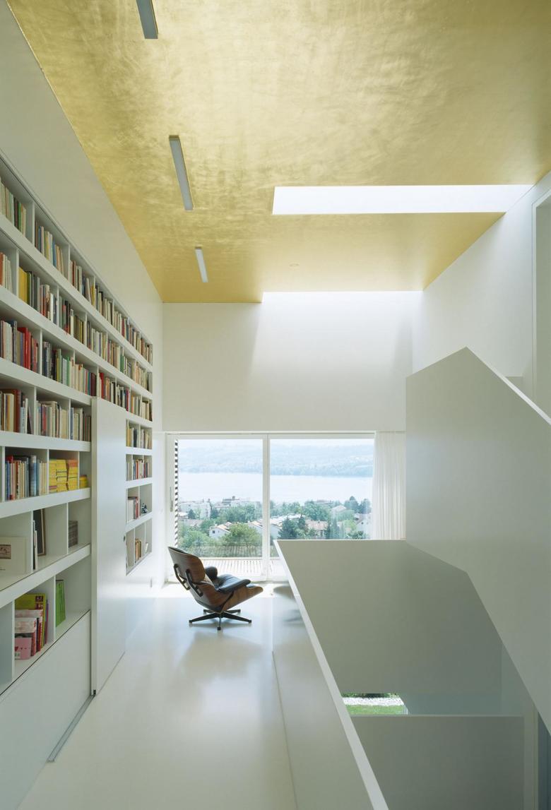 Das raffiniert ineinander geschachtelte Volumen besteht aus einzelnen Raumboxen, die einem zentralen Kern angegliedert sind. Dieser Kern besteht aus der begehbaren, 4-geschossigen Bibliothek und der skulptural ausgestalteten Innentreppe. Alle Räume sind von hier aus erschlossen. Diese Struktur ermöglicht es, die spezielle Höhenentwicklung des Gebäudes im täglichen Gebrauch immer wieder zu spüren. Die räumlich gefassten Balkone öffnen von den verschiedenen Geschossen und Positionen aus eine präzis gestaltete Aussicht auf die Umgebung.