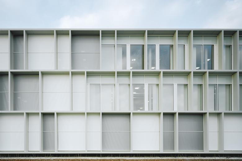 Das architektonische Konzept ist wirtschaftlich und gleichzeitig prägnant. Eine modulare Fassade umhüllt die „zurückhaltenden“ Innenräume und unterstreicht den industriellen Charakter. In Auseinandersetzung mit den örtlichen Begebenheiten und dem Sonnenverlauf entstand ein feststehender, vorgelagerter Sonnenschutz auf drei Gebäudeseiten. Für das in exponierter Lage befindliche Gebäude kann so die notwendige Verschattung der Innenräume gewährleistet werden.
