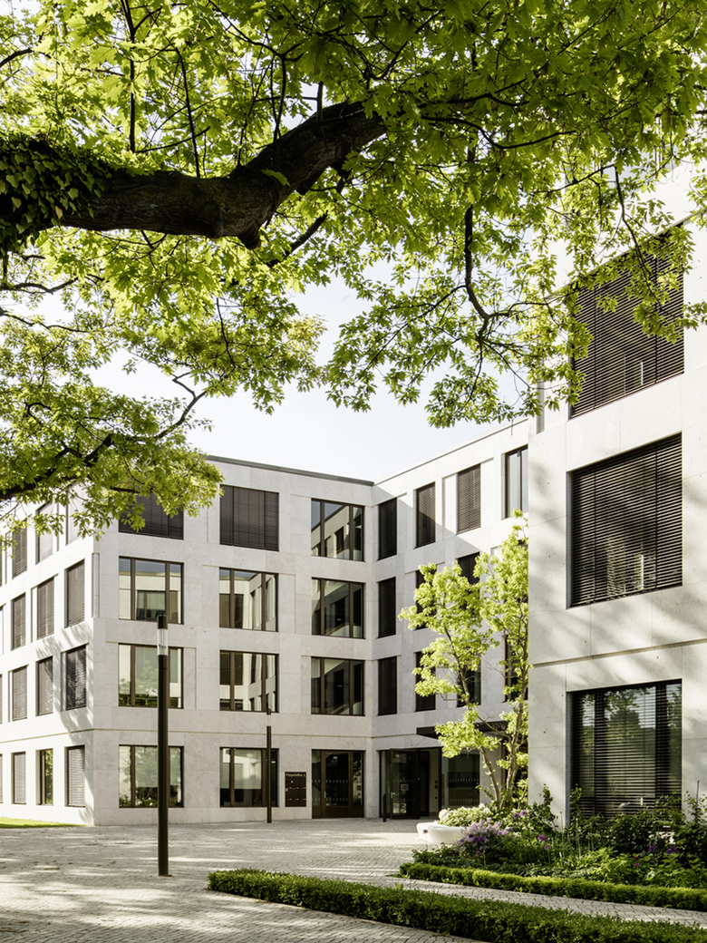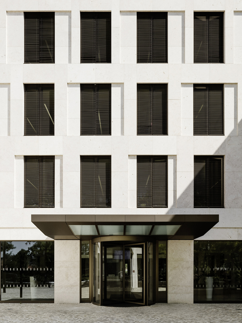 Auf einem Baugrundstück an der Pappelallee in Potsdam wurde ein Büro-und Verwaltungsgebäude für die Kassenärztliche Vereinigung Brandenburg (KVBB) und die Landesärztekammer Brandenburg (LÄKB) entwickelt. Der Baukörper fasst den Straßenraum der Georg-Herrmann-Allee, in dem er in einer Flucht mit der nördlich anschließenden Bebauung ausgerichtet ist. Davon abgesehen ist er als freistehender Solitär konzipiert, der in einen parkartig gestalteten Außenraum mit altem Baumbestand, eingebettet ist. Der durch zwei geschlossene Innenhöfe und einen, zur Straße geöffneten Eingangshof gegliederte Baukörper zeichnet sich durch seine Kompaktheit aus. Im Erdgeschoss lagert sich ein Konferenzbereich um eine zentrale 2-geschossige Halle, die über eine große „Dachlaterne“ von oben belichtet ist. Ohne den Konferenzbetrieb zu tangieren, gelangen die Mitarbeiter über ein zentrales, dem Haupteingang zugeordnetes Treppenhaus in die Bürogeschosse. Fast raumhohe und jeweils zwei oder drei Ausbauraster breite Fensteröffnungen erzeugen ein großzügiges Fassadenbild, das Ausdruck eines offenen und zeitgemäßen Verwaltungsbetriebs ist. Durch die Verwendung eines hellen Muschelkalks entsteht ein Bild im Geiste der Potsdamer Bautradition. Als quasi abstraktes Bild eines Astwerks vollzieht sich durch das sich geschossweise ändernde Verhältnis von vorne und hinten liegenden Pfeileransichtsflächen ein schrittweiser Übergang von leicht zu schwer. Dieser Logik folgend, wird das Sockelgeschoss flächig ausgebildet und über eine Schattenfuge von den Obergeschossen abgesetzt.