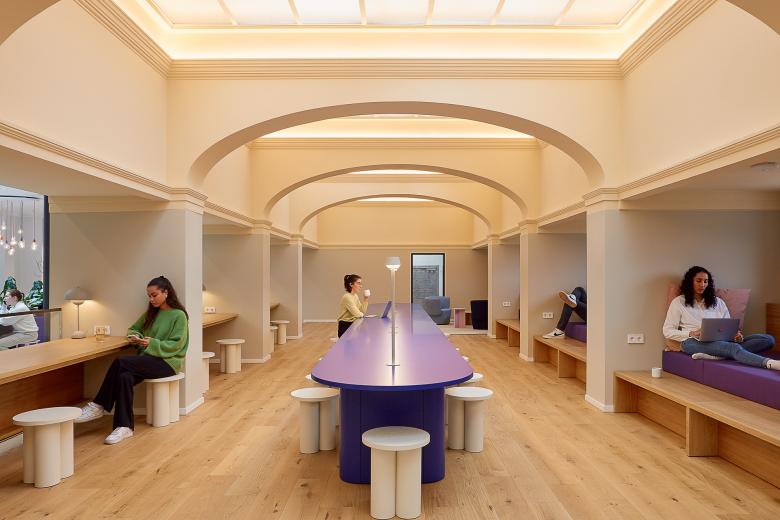 Wo sich ehemals die Badenden auf Ruhebänken erholten, ist jetzt ein besonderer Ort mit Bibliothekscharakter für Still- oder kleine Gruppenarbeiten entstanden – mit maßgefertigten Rückzugsnischen, einem 8.40 Meter langen Community-Tisch und einzelnen Theken-Arbeitsplätzen, die eine Blickbeziehung zum Rest des Büros ermöglichen.
