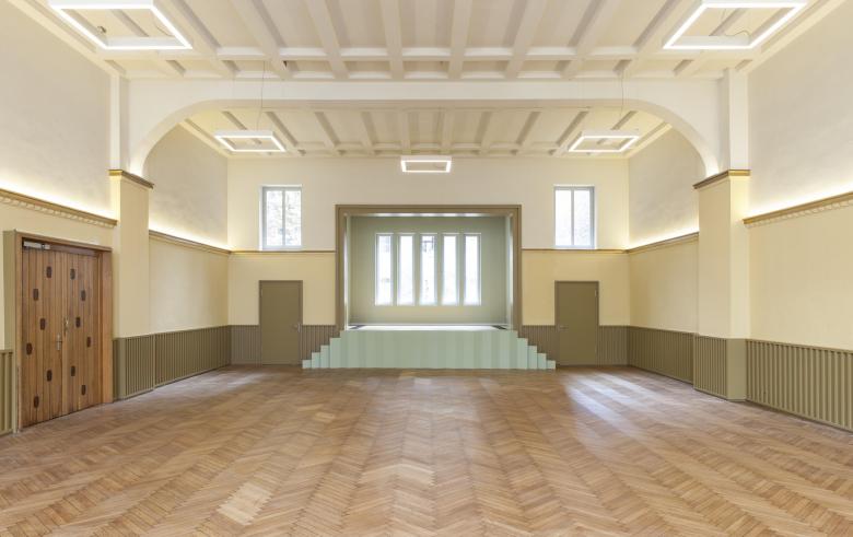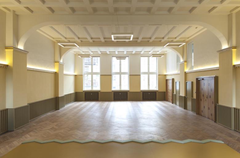 Der 250 qm große ehemalige Gemeindesaal (Agnessaal) im 1. Obergeschoss stellt dabei wohl die eindrucksvollste Räumlichkeit dar. Der Saal wurde in Anlehnung an den Originalzustand mittels moderner Elemente neu gestaltet. Zuvor wurden, um die vorhandene Struktur des Raumes freizulegen, sämtliche nachträgliche Einbauten, Wand- und Deckenbekleidungen zurückgebaut. Dadurch kamen u.a. Elemente, wie die originale Betonkassettendecke und Teile des vorhandenen Wandfrieses zum Vorschein.