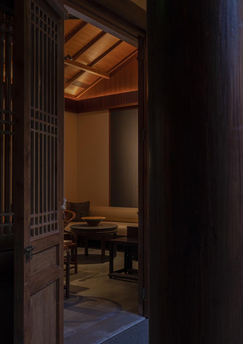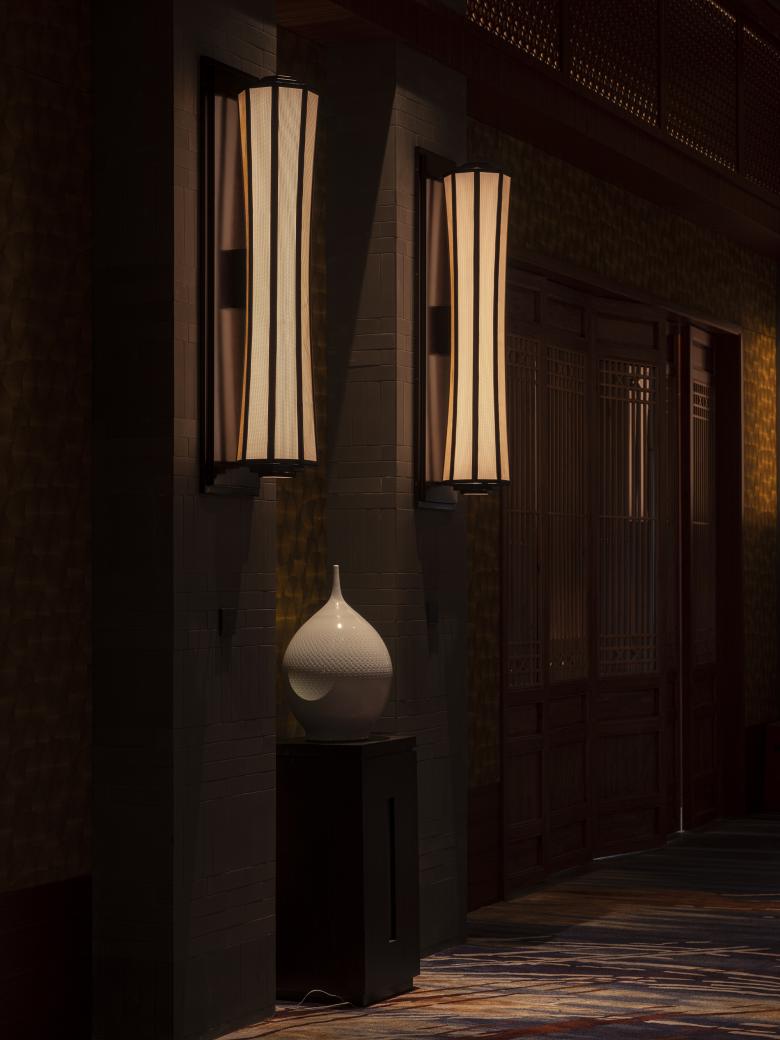 The hidden light behind the fine wooden grille of the banquet hall reveals a subtle and hazy beauty, and also blends a trace of chic and delicacy into the simple Western Sichuan style.