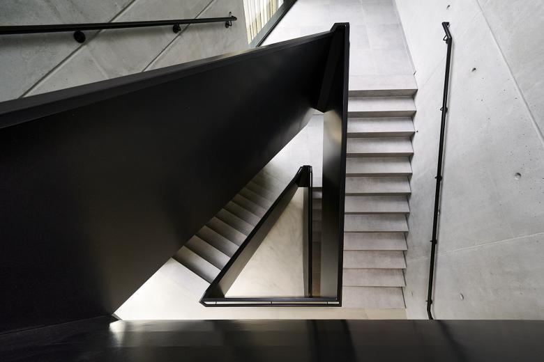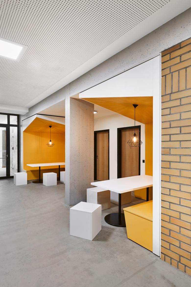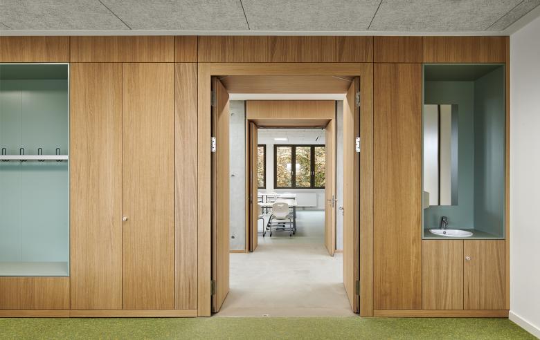 Durch Materialien wie Sichtbeton und Eichenholz verbindet sich der Neubau im Innern mit dem Bestand; eine moderne, zeitgemäße Interpretation verleiht ihm eigene Charakterzüge. Prägen Sichtbetonwände und Estrich die Flure und Treppenhäuser, finden sich in den Klassenräumen Linoleum-Böden. Entlang der Flure ziehen sich Einbauschränke aus Eichenholz, das auch von den Türen und Portalen aufgenommen wird und einen Kontrast bildet zum Sichtbeton. Das zurückhaltende Farb- und Materialkonzept wird in den Klassenzimmern erweitert um grüngraue Farbakzente, die sich in den Einbauschränken und Garderoben wiederfinden, während die lose Möblierung in neutralem Weiß und die Wände in hellen Tönen gehalten sind.