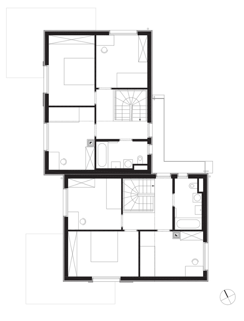 Die kleinen Höfe der beiden Häusergruppen werden miteinander verbunden und entwicklen gemeinsam einen dörflichen Charakter, man kann vor seinem Haus auf dem Vordach-Sitzbank-Element sitzen, tratschen,und den Kindern beim Spielen zu sehen. Jedes Haus hat so auch seine eigene besondere Position am Grundstück, Sonne von 3 Seiten, verschiedenste Gartengrößen und -ausrichtungen, sozusagen für jede Vorliebe das Passende und natürlich Privatsphäre, da die Häuser 90° zueinander gedreht sind.