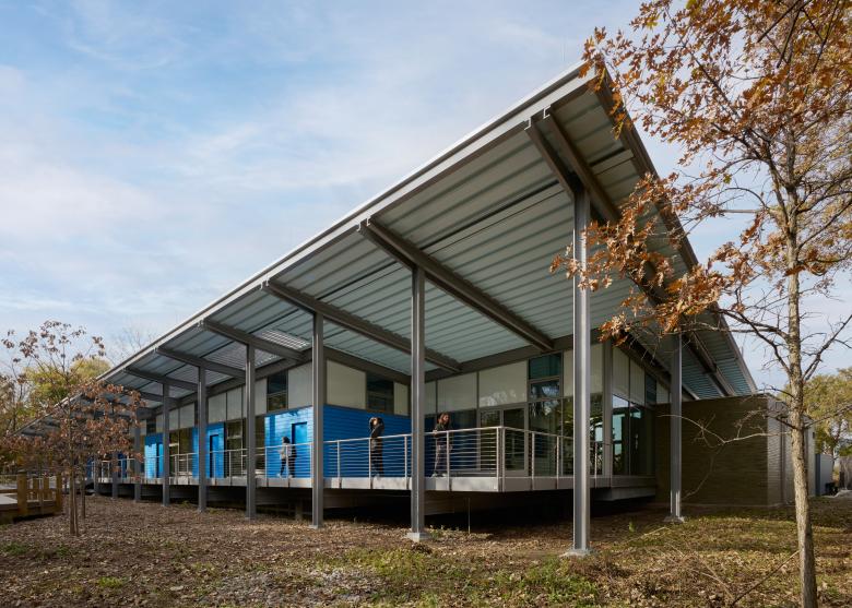 The building maximizes interior and exterior learning space and parking on a very tight site, allowing APEC to expand its capacity. APEC’s famous animal room, traditionally the main attraction, is open to the entry lobby, where the animals welcome visitors directly. Bright and flexible classroom spaces connect students to nature trails and extend outdoors. These classrooms have walls that open to create a single space for events. Exterior classrooms include a sheltered observation deck and stepped seating under the tree canopy.