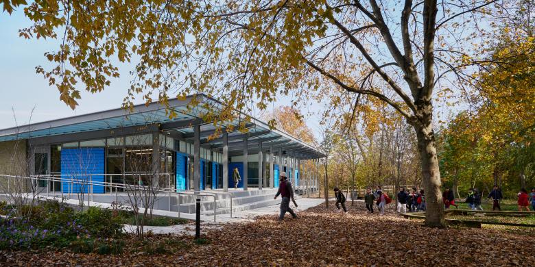 With its organic green brick wall and dramatic sloping roof, the new Alley Pond Environmental Center (APEC) offers an innovative and immersive learning experience to over 100,000 students a year and a new gateway to one of the most beautiful and expansive wetland ecosystems in New York City. Designed in collaboration with APEC educators, board, and staff, the building reflects APEC’s mission of education and environmental stewardship.