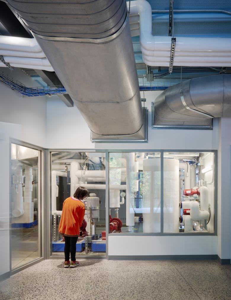 In addition to targeting LEED Gold certification, the building doubles as a teaching tool that highlights sustainable building practices. Mechanical and environmental systems are exposed so educators can share the building’s sustainable features with students and visitors: toilets flushed with rainwater, a geothermal system that takes energy from the ground to heat and cool the building, light-diffusing windows and skylights that provide daylighting and natural ventilation. Large windows in the mechanical room further display the building’s inner workings. Comfort and well-being were also primary goals: warm floors create cozy learning spaces, and even daylighting and sound-absorbent ceilings offer a calming environment. In the landscape, native planting in parking lot bioswales cleans rainwater runoff and keeps it from inundating the city sewer.