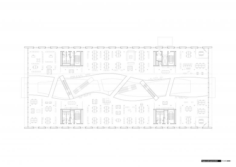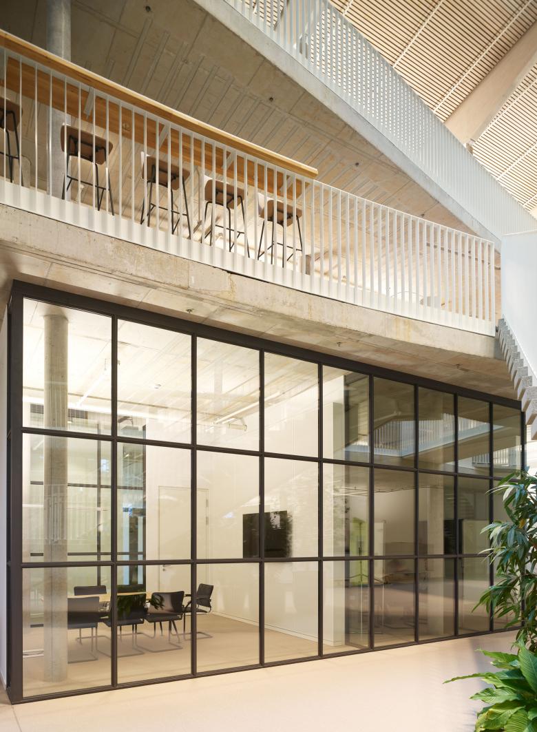 Die Arbeitswelt verliert sich nicht in einzelnen Abteilungen, abgeschlossenen Räumen und unübersichtlichen Gängen: Es ist ein großer Raum, der sich vom Erdgeschoss bis unter das Dach, zwischen den Fassaden ohne störende Trennwände aufspannt, der den Mitarbeitern und dem Unternehmen eine unbegrenzte Vielfalt an Gestaltungsmöglichkeiten bietet und mit dem Dogma starrer Bürostrukturen bricht. Es existiert eine Vielfalt an Räumen, die eine lebendige und flexible Arbeitsatmosphäre ermöglichen. Mit akustisch wirksamen Vorhängen können Besprechungsbereiche bei Bedarf abgetrennt werden. Zudem befinden sich auf allen Ebenen offene Teeküchen, die von den interfunktionalen Teams als Besprechungsorte genutzt werden können. Der Übergang zwischen öffentlichem und internem Bereich ist fließend. So funktioniert das Erdgeschoss als Treffpunkt, der die unkomplizierte Begegnung von Besuchern und Mitarbeitern ermöglicht.