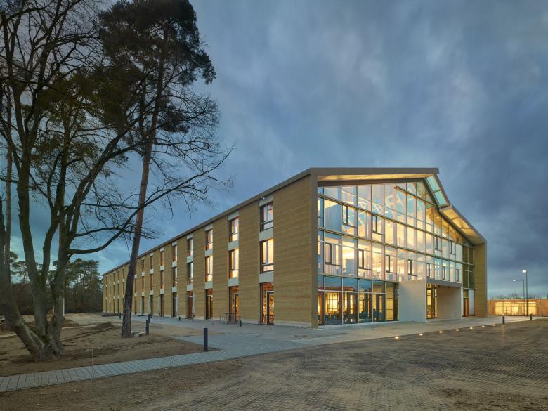In Darmstadt ist mit der Alnatura Arbeitswelt ein architektonischer Meilenstein in puncto Nachhaltigkeit, Materialeffizienz, Offenheit und moderner Arbeitsformen entstanden. Zu den Besonderheiten des von haascookzemmrich STUDIO2050 konzipierten Gebäudes am Alnatura Campus, zählt der Einsatz einer innovativen Stampflehmfassade, die weltweit erstmals mit einer geothermischen Wandheizung belegt wurde. Außergewöhnlich ist auch die schallwirksame Holzlamellendecke, die das Atrium und die komplett offen gehaltenen Büroflächen überspannt.