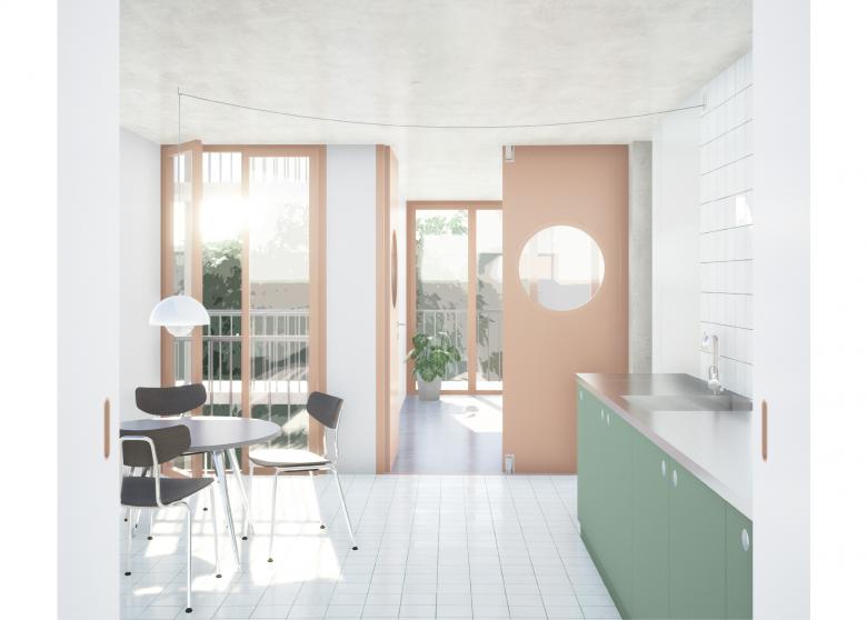 Der Bereich der Bäder/Wohnküchen ist der eigentlich installierte Bereich der Wohnungen. Jeweils zwei Küchen und Bäder liegen nahe aneinander und bieten so eine effiziente Versorgung der Wohnungen. Die Raumgrössen und Ausstattung ist nach SIA500 nutz- oder umbaubar.