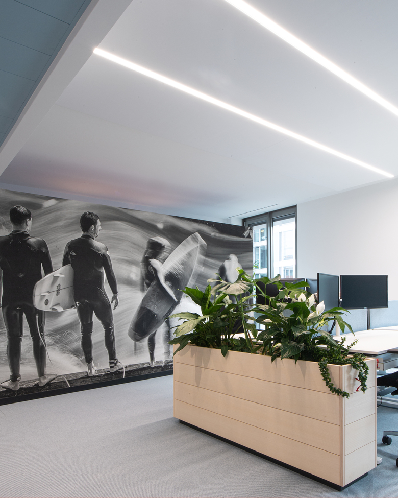 Der offene Bürobereich wird durch großflächige Schwarzweißphotographien von Eisbachsurfern und dem Englischen Garten eingerahmt. Im Open Office schaffen, ergänzend zu privaten Rückzugsbereichen und Besprechungsräumen, Schaukeln eine agile Arbeitsstruktur. Hierdurch werden vielseitige Möglichkeiten geschaffen konzentriert und gemeinschaftlich zu Arbeiten.