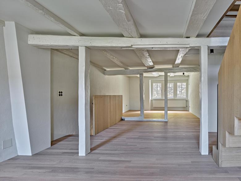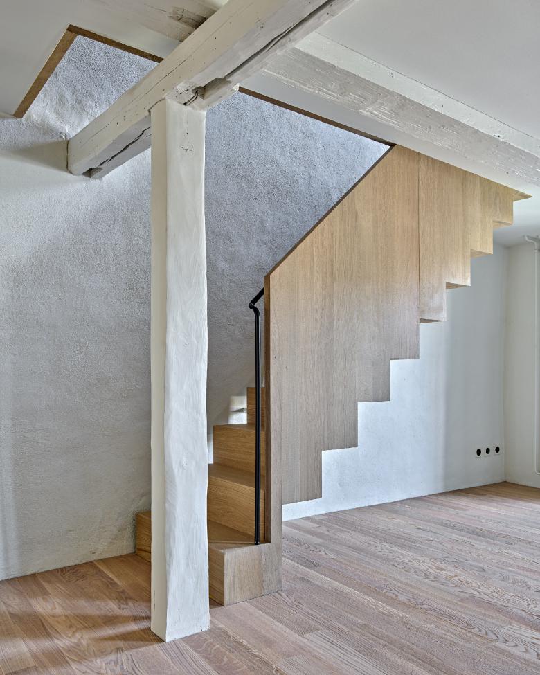 Alle Geschosse vom Erdgeschoss bis ins Dachgeschoss werden durch raumprägende Treppenelemente verbunden. Das geölte Eichenparkett in allen Geschossen trägt zum durchgehenden Raumkontinuum bei. Die komplett sanierten Nasszellen sind als eingestellte Raummöbel konzipiert. Zur Optimierung der Raumbelichtung konnten westseitig bestehende kleinere Rundgauben durch grosszügigere Öffnungen ersetzt werden. Der Aussenraum ist Bestandteil der historischen Haldengärten im Garteninventar der Stadt Aarau. Dieser wird durch eine vorgebaute Terrasse angebunden und bietet damit eine Wohnqualitätserweiterung innerhalb der räumlich begrenzten Altstadtstrukturen. Das Ergebnis ist eine individuelle Symbiose von Alt und Neu, die Denkmal und Gegenwart miteinander verbindet.