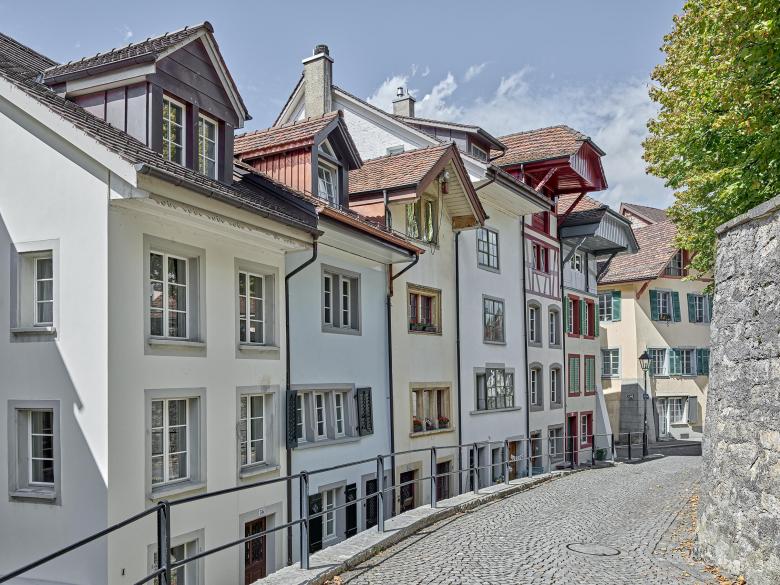 Das denkmalgeschützte Altstadthaus als Bestandteil des äusseren Altstadtringes in Aarau, wurde seit seiner Entstehung mehrfach saniert und erweitert. Die Zeit hat ihre Spuren in Form baulicher Eingriffe hinterlassen. Ursprünglich zweigeschossig, wurde das schmale, spätgotische Gebäude später um ein drittes Obergeschoss aufgestockt. Nach einer Totalsanierung in den 80er-Jahren und einem Dachausbau 2003 wurde der Bestand nun bis auf die alte Bausubstanz zurückgebaut und Balken, Mauerwerk und Stützen freigelegt. Nach der umfassenden Neugestaltung des Gebäudeinneren unter Berücksichtigung von denkmalpflegerischen Gesichtspunkten, den ursprünglichen Raumstrukturen und einer Sanierung des Daches wird das Gebäude weiterhin als Einfamilienhaus genutzt, das zukünftig von einer jungen Familie mit kleinen Kindern bewohnt und belebt wird.