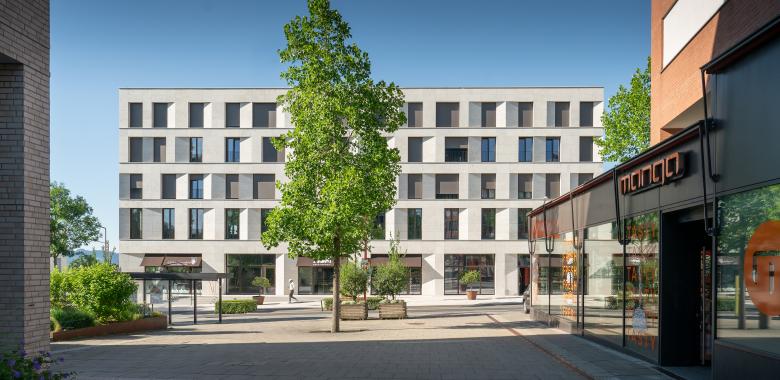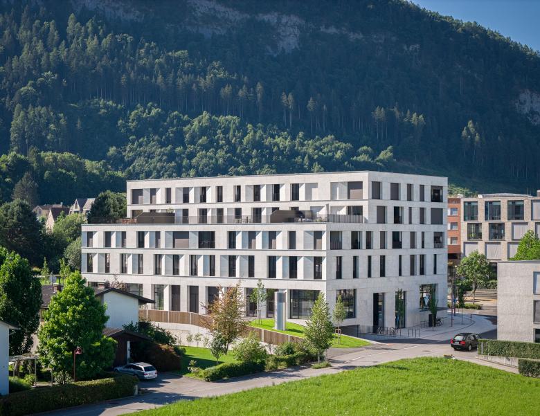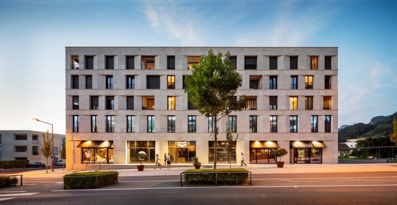 Die Ziele: Zur Vervollständigung der Quartiersentwicklung Am Garnmarkt sollte der Neubau eines Geschäfts-, Büro- und Wohnhauses ent¬stehen. Die Umsetzung: Mit dem markanten Gebäude hat das Quartier einen attraktiven Abschluss erhalten. Es bildet den Übergang von der dichten Bebauung im Zentrum hin zum lockeren Siedlungsgebiet im Norden. Im Süden umfasst das Haus fünf Etagen, zum Norden hin drei Geschosse. Im EG sind Flächen für Handel und Gastronomie, im 1. OG für ein Fitnessstudio verfügbar. In den oberen Geschossen liegen 30 Wohneinheiten – 1- bis 4-Zimmer-Wohnungen mit hochwertiger Ausstattung und Loggia. Die Merkmale: Die bodentiefen Panorama-fenster bieten einen einzigartigen Blick auf die Schweizer Berge, je nach Lage der Wohnung alternativ einen Ausblick auf die Flanierzone Am Garnmarkt. Zum markanten Erscheinungsbild des Gebäudes trägt insbesondere die Lochfassade mit den schrägen Fensterleibungen bei. Die Gesimse dienen der horizontalen Gliederung, das Spiel mit schrägen Leibungen seitlich der Fenster bringt Spannung in die Fassade. Zudem stellt das hochwertige Natursteinkleid des Gebäudes mit seiner Struktur und Farbigkeit einen visuellen Bezug zum Ort her. In Abstimmung mit der Gemeinde Götzis entsteht ein gemeinsam nutzbarer neuer Park- und Grünraum.