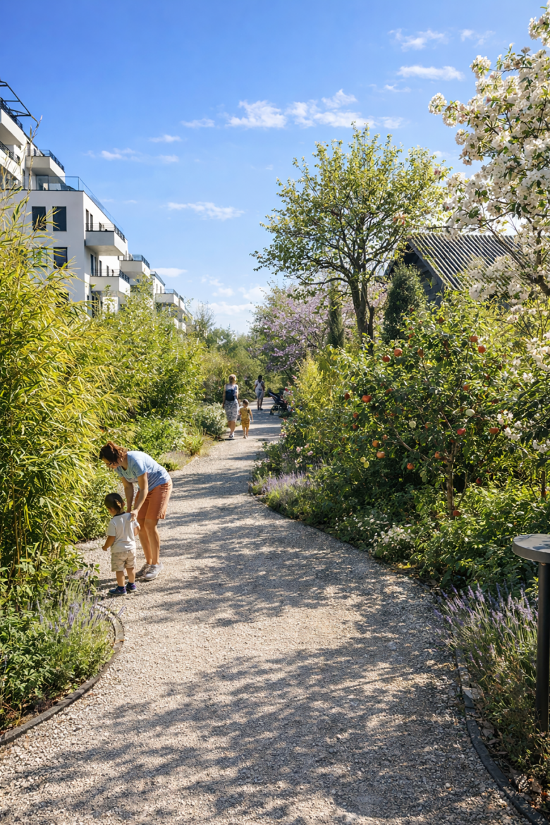 So entsteht ein vielschichtiger Freiraum, der Orientierung, Vielfalt und Aufenthaltsqualität vereint – ein Gartenquartier, das den Menschen in den Mittelpunkt stellt und Natur als integralen Bestandteil des Wohnens erlebbar macht.