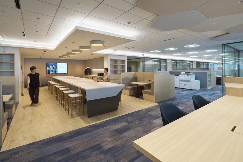 今回拡張したエリアでは、部署間にあった壁を取り払い、より活発なコミュニケーションを生み出すことを企図し、一部エリアにABW(Activity-Based Working)を導入。業務に応じて ノイズを適切にコントロールし、集中作業とコミュニケーションが両立できる空間を実現しました。