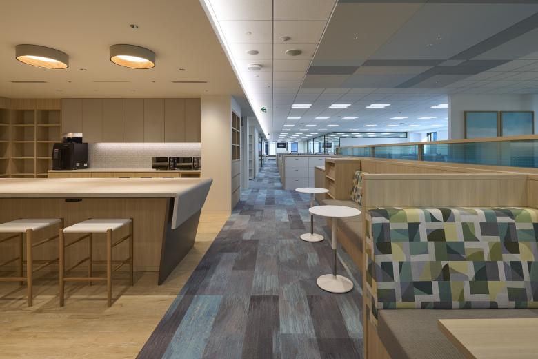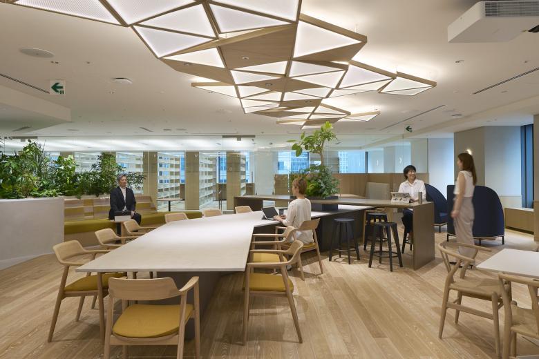 人が集まるオフィスの核として新たに計画したカフェでは、布をモチーフにした装飾的なオリジナル照明をシンボルとして天井に設置。落ち着きのある上質なトーンでまとめ上げたこの空間は、可動の家具配置や、シーン設定を変えることのできる照明計画により、ランチや休憩時間以外にも、社員同士の交流や学び、時に楽しみの場として幅広く活用されています。