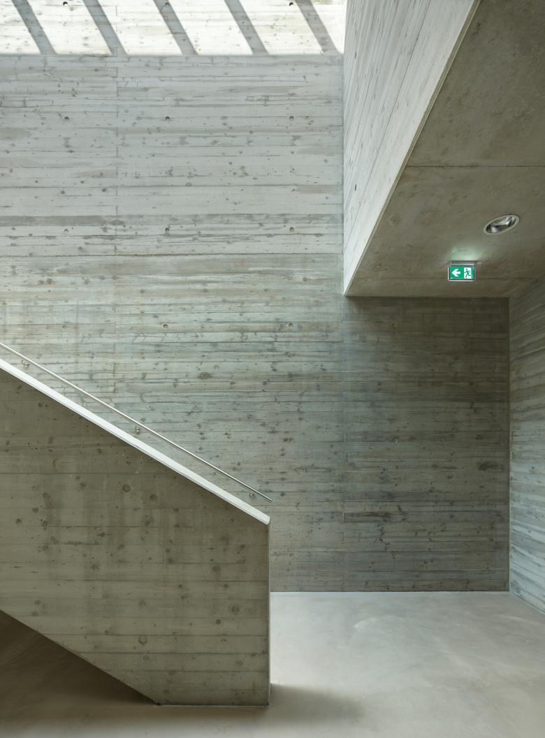 Im Bereich des Foyers ist die Konstruktion durch einen großen Anteil an Sichtbetonflächen erlebbar. Die sich abzeichnende horizontale Bretterschalung greif dabei Thema der Schichtung aus Fassade auf, und überträgt es in den Innenraum.