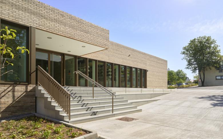 Das architektonische Konzept sieht eine klare Kubatur mit großzügigen Öffnungen vor, wobei sich die einzelnen Nutzungsbereiche in ihrer Höhenentwicklung abzeichnen und somit einen differenzierten Baukörper entstehen lassen. Durch die Verschränkung beider Körper entsteht ein überdachter Eingangsbereich mit vorgelagerter Treppen- und Sitzstufenanlage.