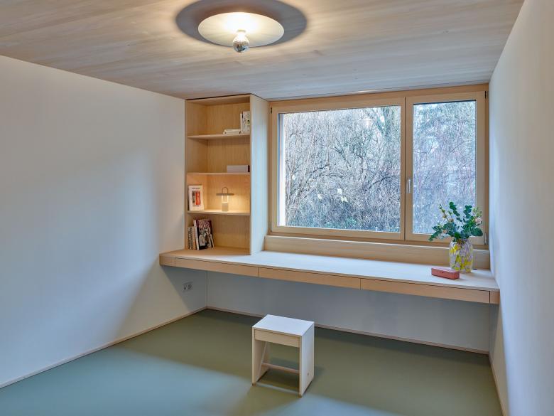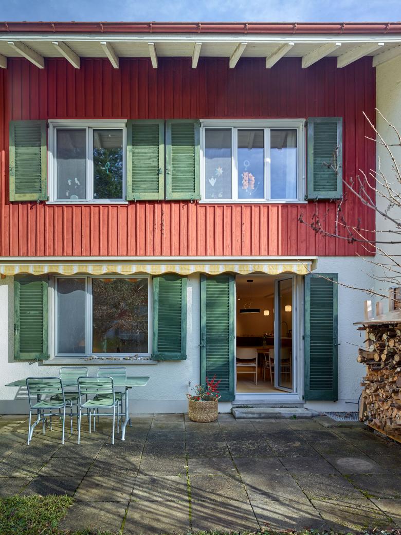An- und Umbau eines Reihenhauses im Schachenquartier in Winterthur-Veltheim. Der Anbau mit Eingangsbereich, zwei Zimmer und Bad ist in Holzkonstruktion mit einer vertikalen Sichtholzschalung und Sichtholzfenster.