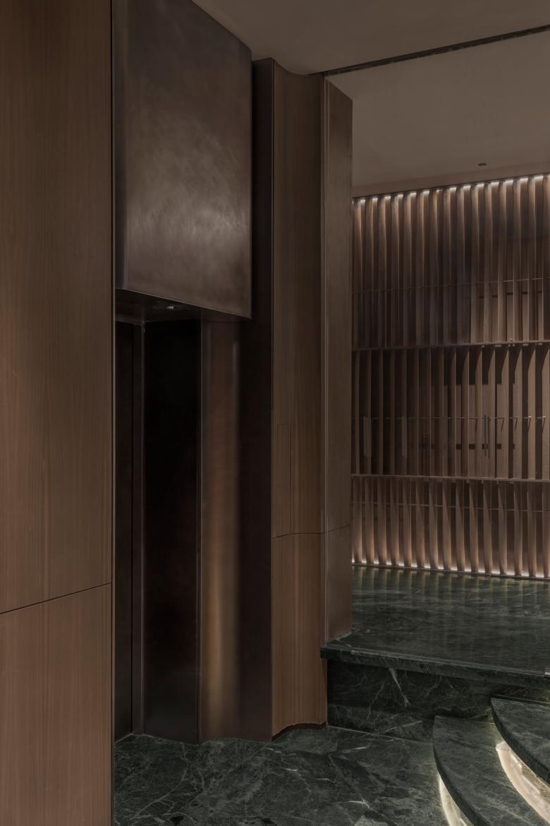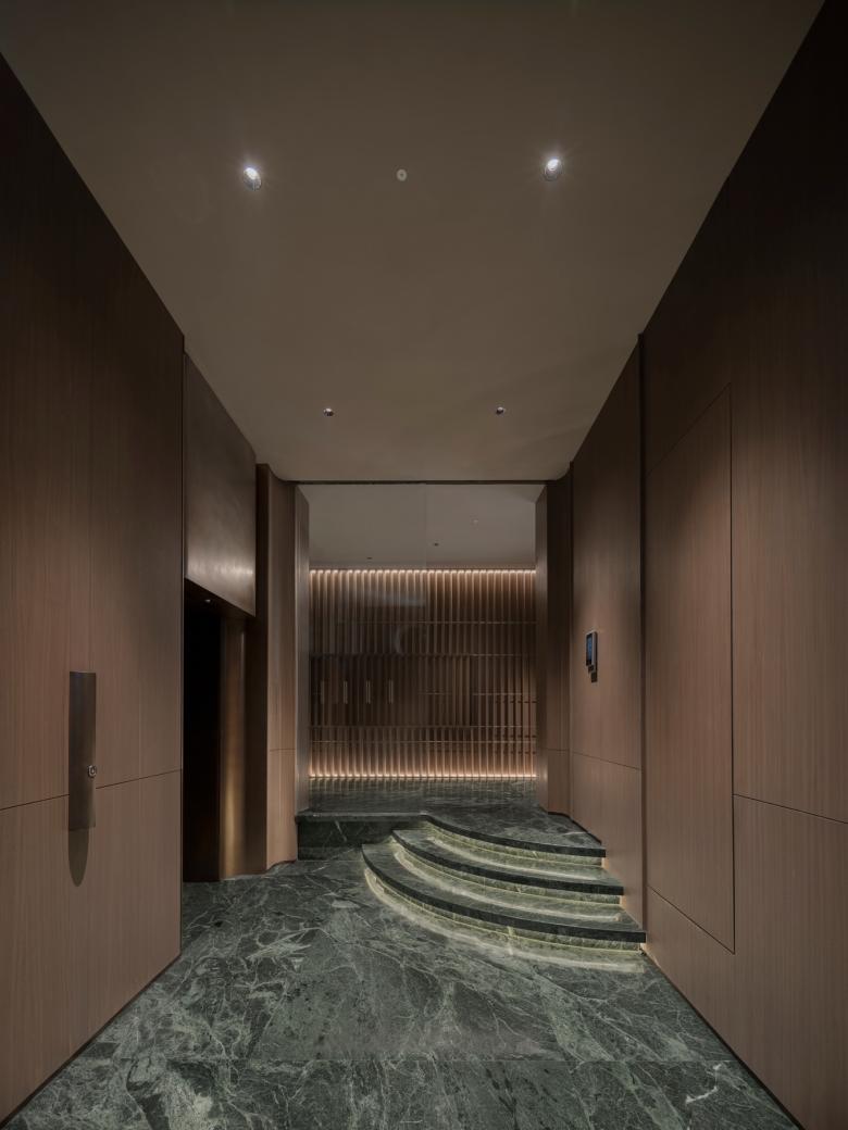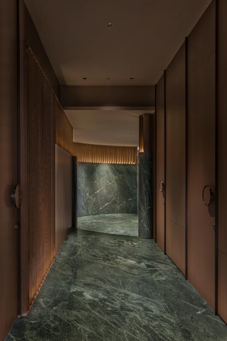 Taking the hotel's internal lift to the top floor, the warm light in the lift lobby marks the beginning of the entire hotel-style office setting. Prada green marble is widely used in public spaces, cleverly combined with bronze matte metal, warm wood, and soft indi-rect lighting to create a comfortable, calm, low-key, and elegant space atmosphere.