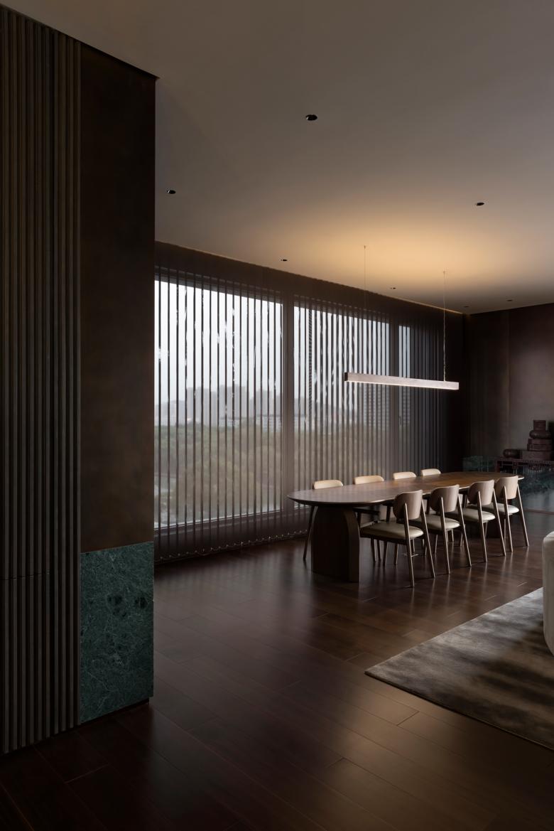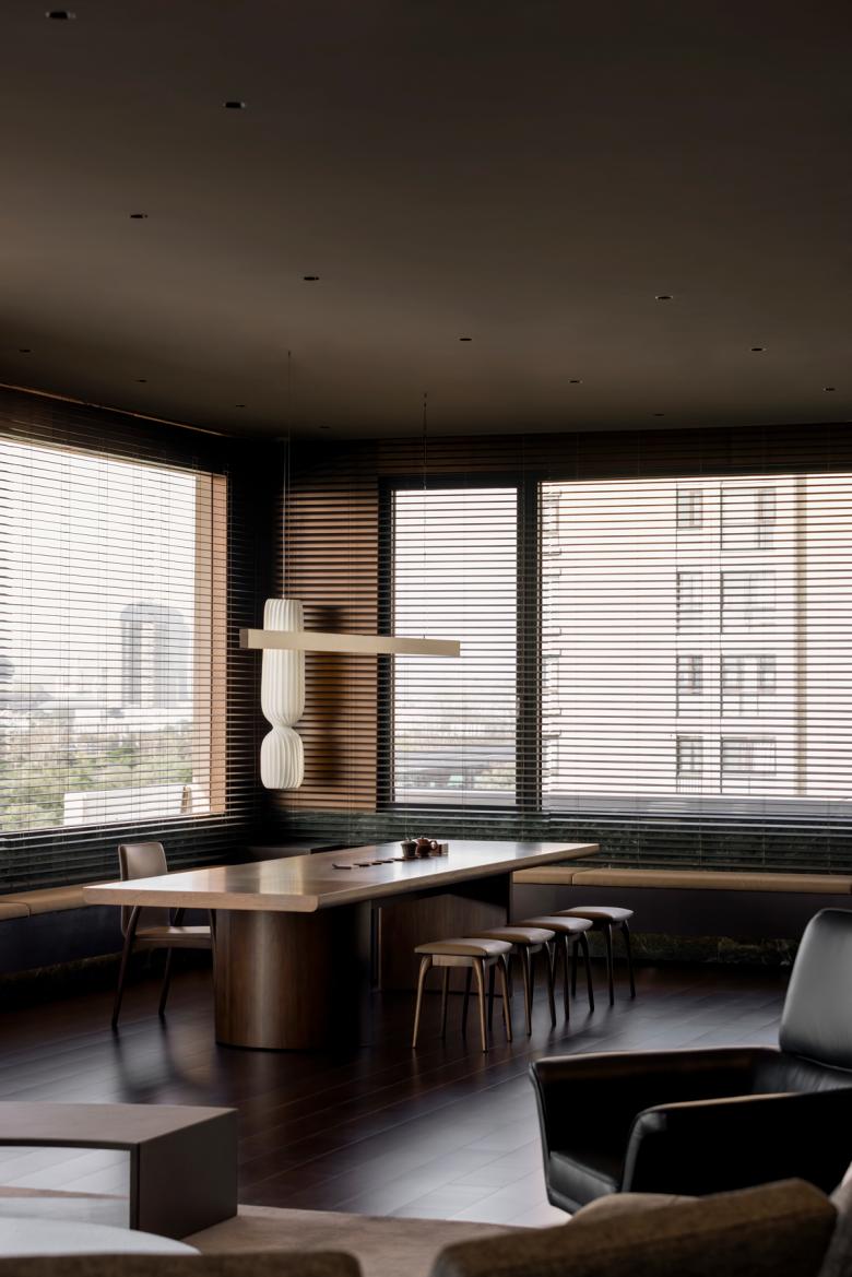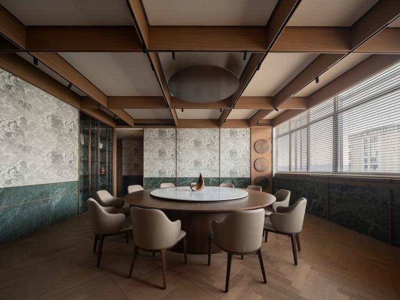 The dining space continues the texture of the space, adding more wooden details and matching them with black and white patterned wallpaper, combining the reverence, pri-vacy, and social attributes of banquets with the comfort and elegance of public areas.