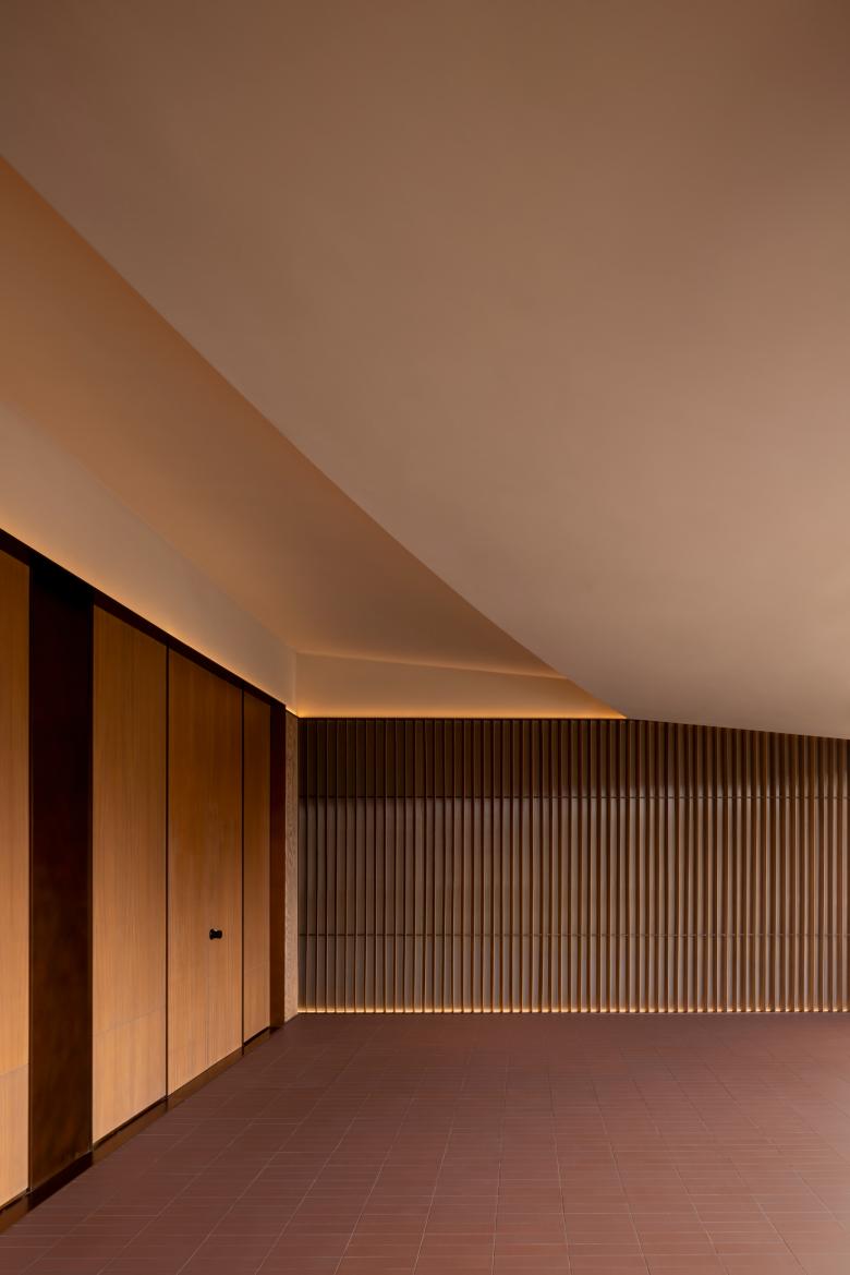The semi-arc corridor is combined with the outdoor courtyard, which integrates the characteristics of indoor and outdoor spaces. The application of outdoor strip bricks on the ground and the opening and closing of multiple sets of pivot doors realise the free transformation between outside and inside, bringing an outdoor-like aerial courtyard experience. One side of the wall integrates entrance doors to six individual offices, with wooden lattice and doors made of the same colour material, creating the overall integri-ty of the space. The clean vertical lines bring delicate rhythm changes to elevation in the corridor.
