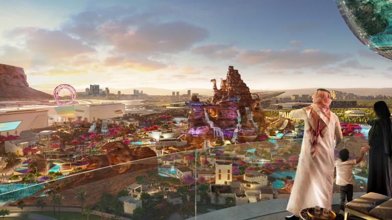 The formal language of the project emerges from desert geology. Curved planes, layered masses, and fluid geometries reference the Tuwaiq Escarpment, shifting dunes, and ancient riverbeds. Built forms appear carved rather than imposed, blurring the boundary between constructed elements and terrain. Monumental water attractions are embedded within this landscape logic, allowing architecture and infrastructure to read as part of a continuous ground condition.