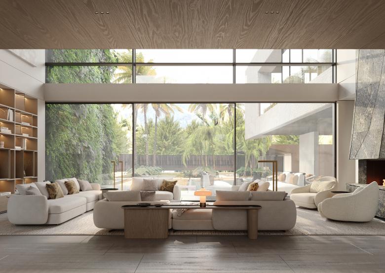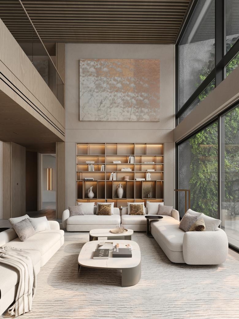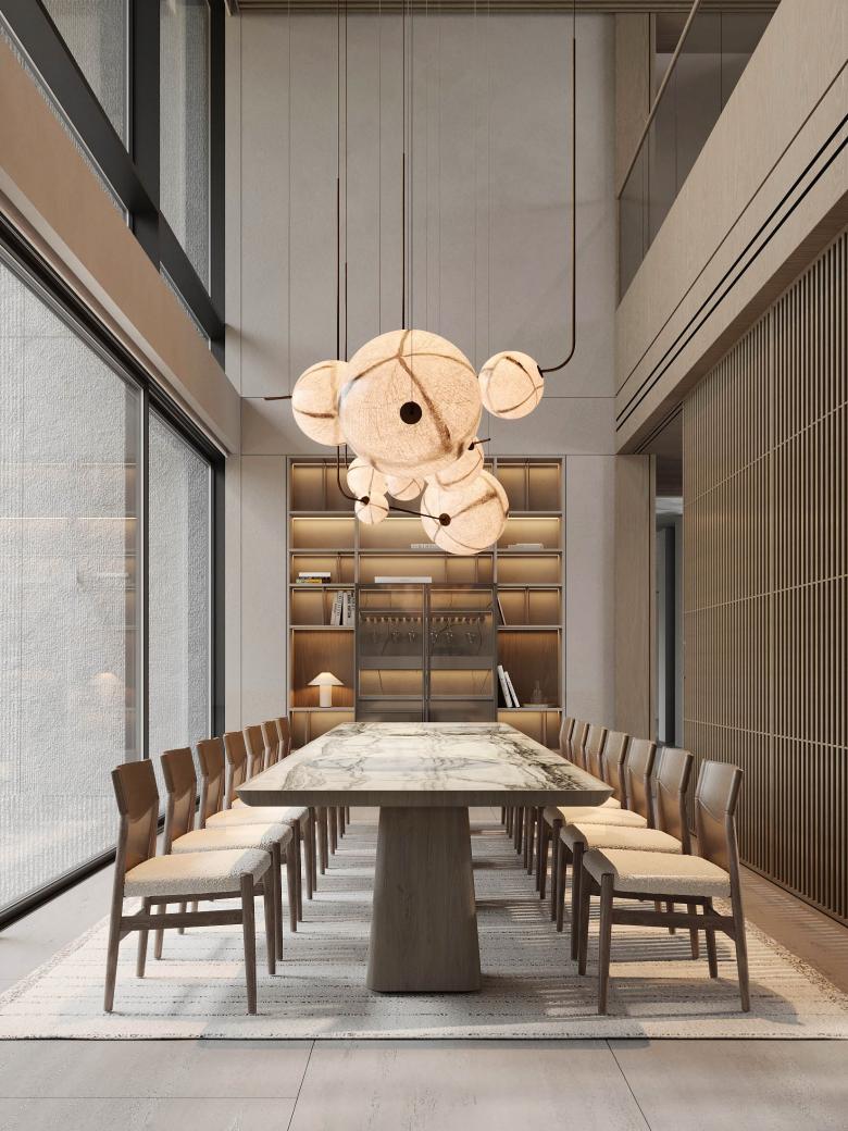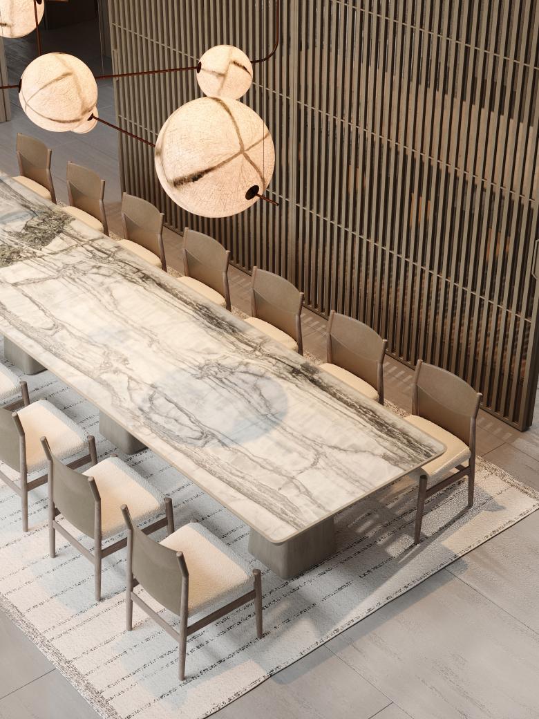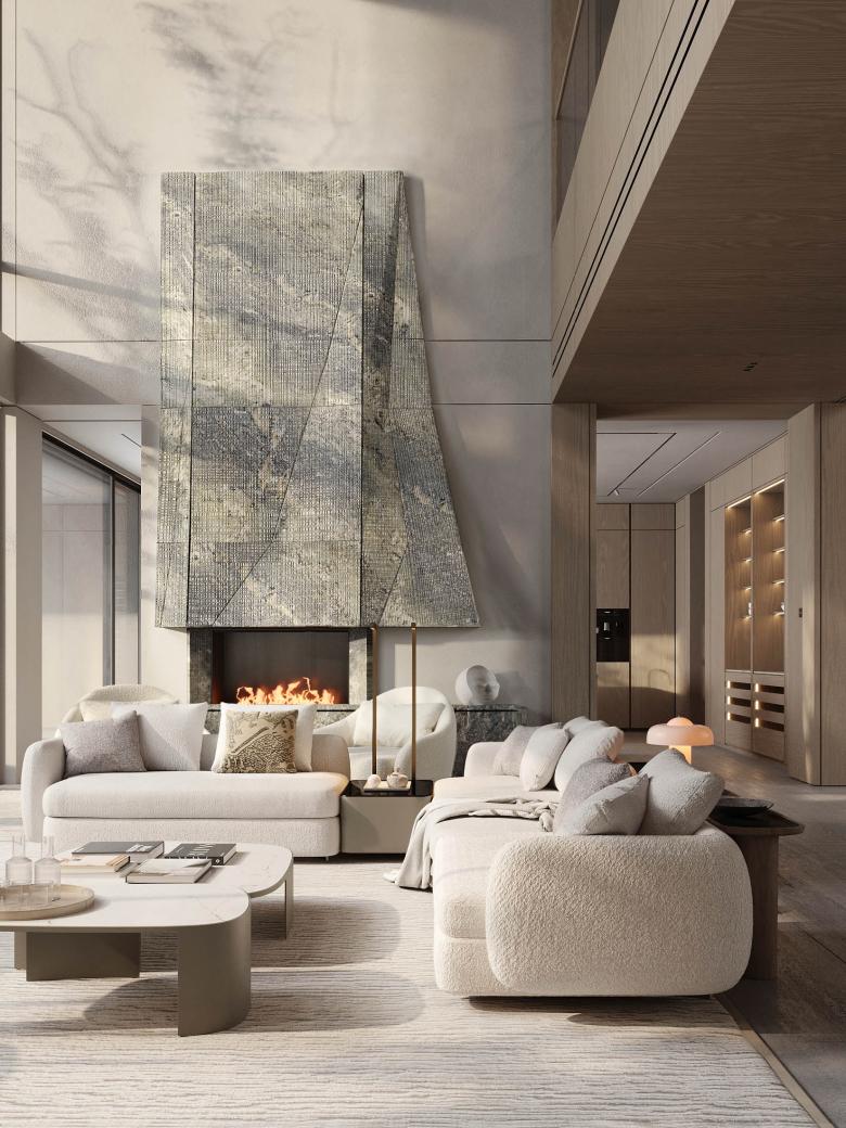 The core idea behind Ashen Villa was to integrate functional adaptability within the living spaces. The client was given the flexibility to choose how each room could evolve over time. For example, bedrooms can be converted into offices or children's rooms, depending on future needs. The design emphasizes fluidity, with spaces flowing into one another. The use of light-green marble, sourced from the client's stone factory, became an essential element, featured prominently in key design details such as the fireplace and staircase.