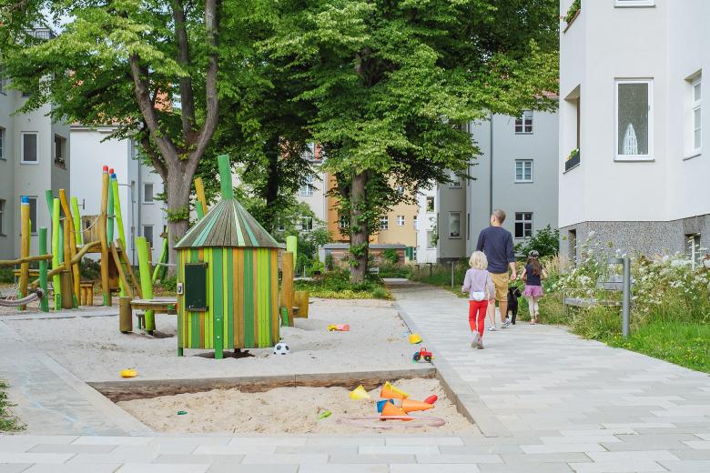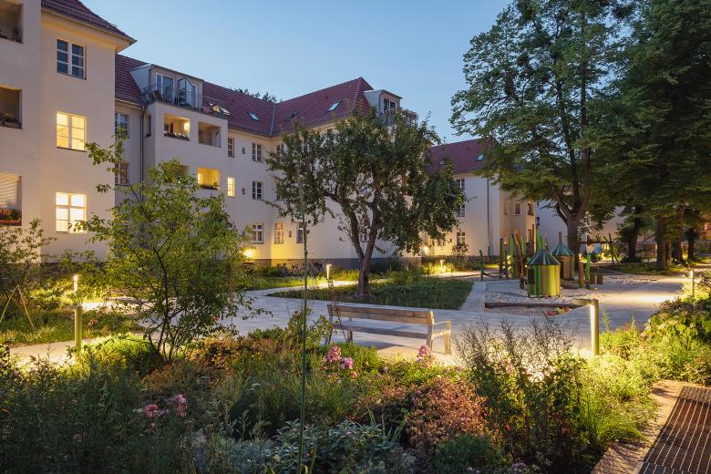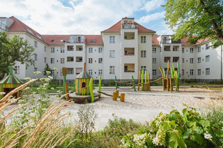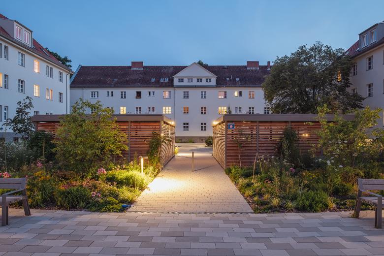 Die Vorgartenbereiche und die beiden Blockinnenhöfe der Wohnanlage Asternplatz sind im Zuge von Dachgeschossausbau und Fassadensanierung der Ende des 19. Jahrhunderts entstandenen Gebäude behutsam neu gestaltet worden. Wir haben die großzügigen Freiflächen mit dem zum Teil geschütztem Baumbestand erhalten und durch eine Neustrukturierung des Raumes und das Hinzufügen von hochwertigen Spiel- und Ausstattungselementen aufgewertet. Die Erschließung des Hofes wird neu geordnet, indem die mittig liegenden Baumpflanzungen mit einem klaren, orthogonalen Wegerahmen eingefasst werden, der sich westlich und östlich in einem kleinen Platz aufweitet. Wir greifen die Wege- und Blickbeziehung innerhalb des Blockinnenbereichs auf und strukturieren so die Spiel-, Pflanz-, Rasen- und Wegeflächen in spannungsvoller Weise. Überdachte Fahrrad- und Müllhäuser bilden die räumliche Abgrenzung zu den neuen Pkw-Stellplätzen und etablieren eine Torsituation zum inneren Gartenraum. Großzügige Stauden- und Gräserpflanzungen entlang der Häuser und Platzflächen entwickeln sich zu einem blühenden Blickfang.