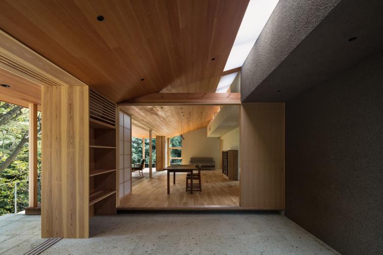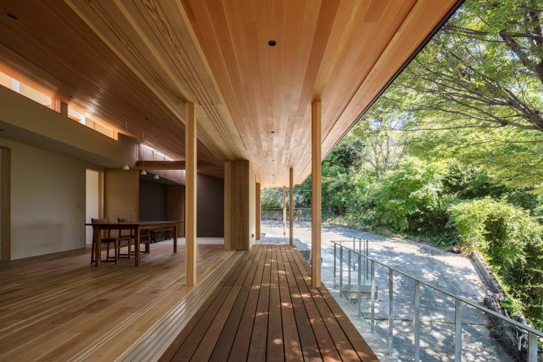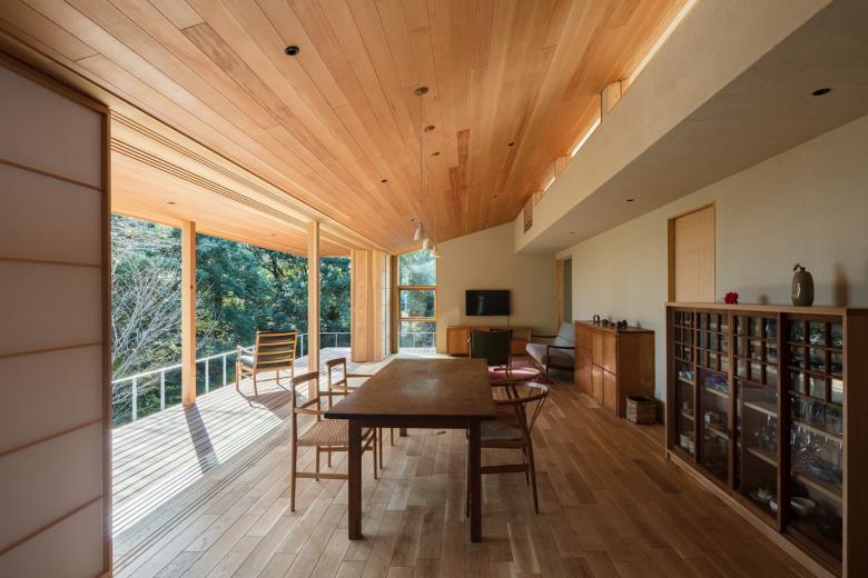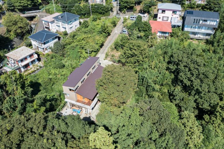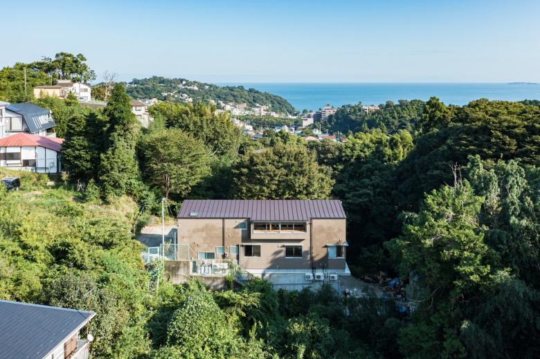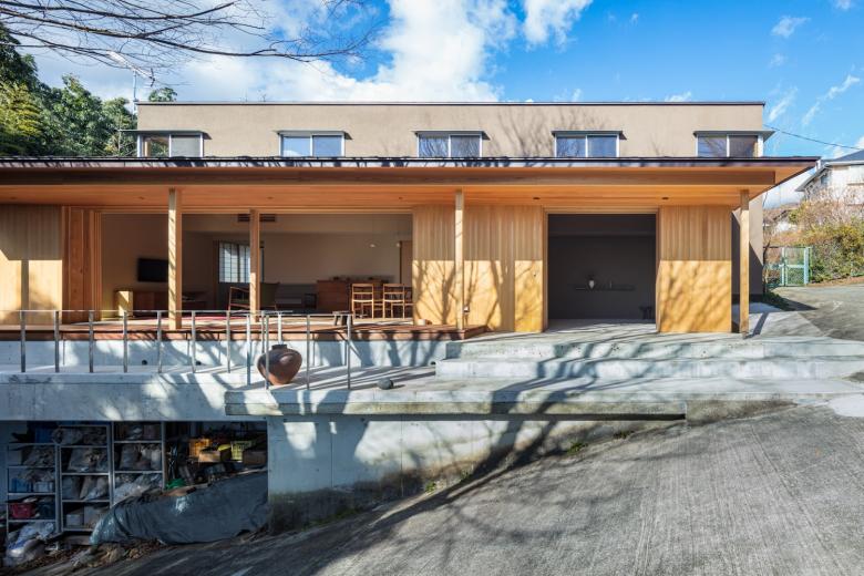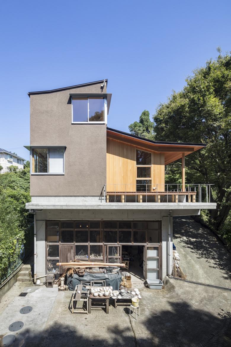 施主の陶芸家夫妻は20年程前に遠くに真鶴湾を望むこの土地に移住してきた。斜面に半分が埋まるRC造の地下とその上に載る木造2階建の中古住宅を購入した。2人の子供たちが家を離れることを機に、アトリエとして利用している地下躯体を残して上屋を建て替えることにした。
