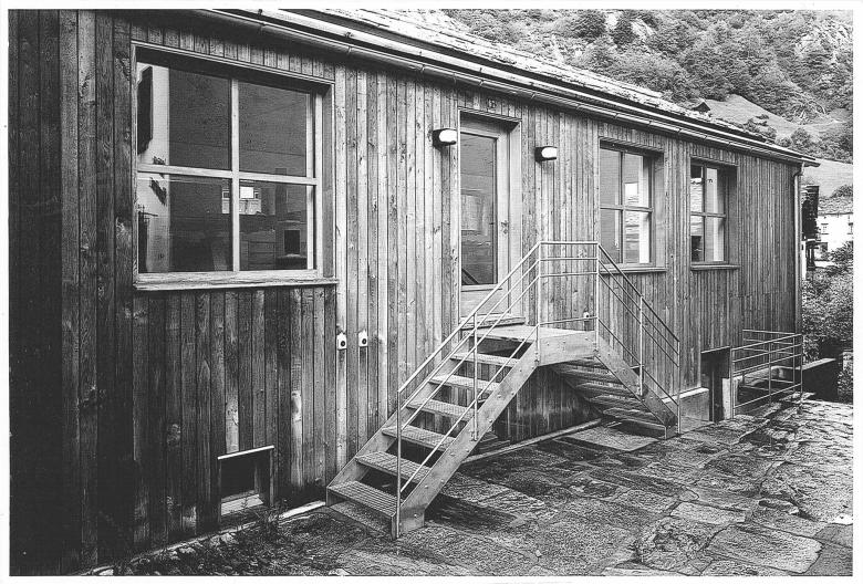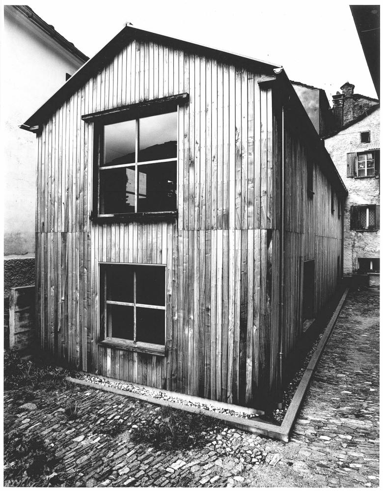 Das Atelier liegt in einer Nebengasse. Die schlichten Fassaden aus Kastanienholz geben zu verstehen, dass es sich beim Atelier nicht um ein Wohnhaus handelt. Eine aufs Essenzielle bedachte Architektur verleiht dem Bau einen nahezu naiven Charakter: eine prismenförmige Holzschachtel mit einem Deckel aus zwei abgeschrägten Steinflächen. Die minimalistische Architektursprache wird getragen von einer konsequenten Prüfung der Details und einer angemessenen geometrischen Gestaltung. Es wurden lokale Materialien verwendet, deren Gebrauch ist in diesem Fall eine experimentelle Neuinterpretation lokaler Gegebenheiten.