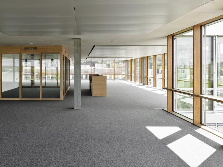 Der Innenausbau erzeugt mit den Eichenholztrennwänden und Einbauten, dem dunklen Nadelfilzhohlboden, den Kühldeckenelementen aus Aluminium und der Pfosten-Riegel-Fassade in Holz-Metall einen wertigen und reduziert gestalteten architektonischen Ausdruck, der dem progressiven Geiste des Ausbildungszentrums angemessen Rechnung tragen soll.
