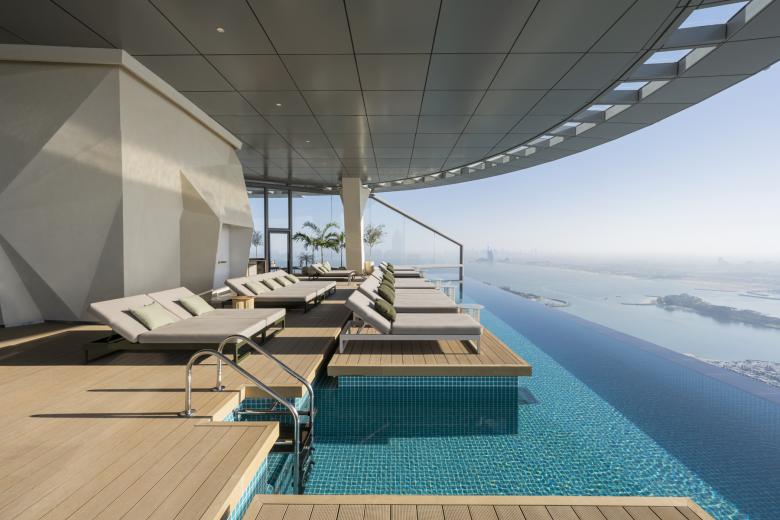 In creating the AURA SKYPOOL, Kokaistudios’ remit was to frame and contextualize the location’s breathtaking views. It achieves this through a design dialogue between outdoor and indoor; manmade islands versus imagined ones; above water and below. As the world's highest 360° infinity pool, the destination has fast become one of Dubai’s must-visit experiences. At the same time, its combination of tactile features, natural breeze, fluttering canopies, and above all, glittering blue water that seems to meet the sky feels nothing short of exclusive, luxurious, and far removed from the heat and intensity of this unique urban center.