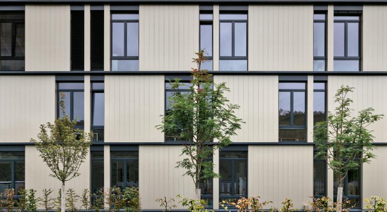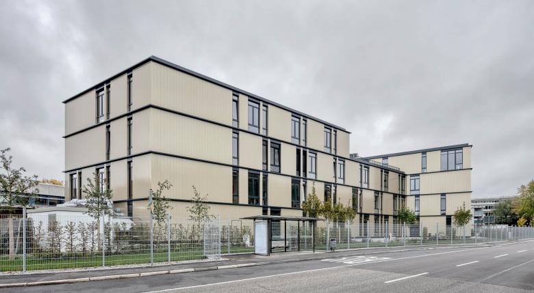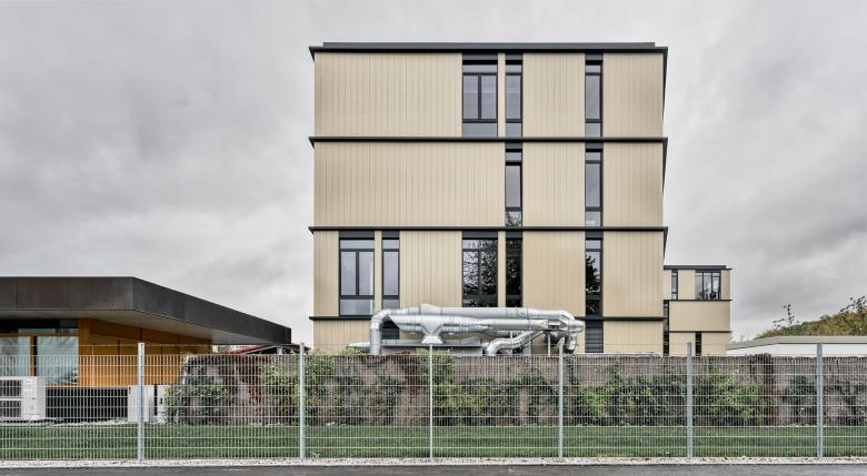 Die Verglasungsanteile bieten eine großzügige Belichtung und Belüftung der großen Ausbildungsflächen und gleichzeitig den Ausblick auf die attraktive Szenerie des Neckars. Die viergeschossige Stahlbeton-Skelett-Struktur ist mit gedämmten Stahlkassetten und hinterlüfteten goldfarbenen Aluminiumpaneelen verkleidet. Die anthrazitfarbenen Lisenen und Fensterlaibungen bilden dazu einen spannenden Kontrast und heben die abwechslungsreiche Modulation der Fassade hervor.