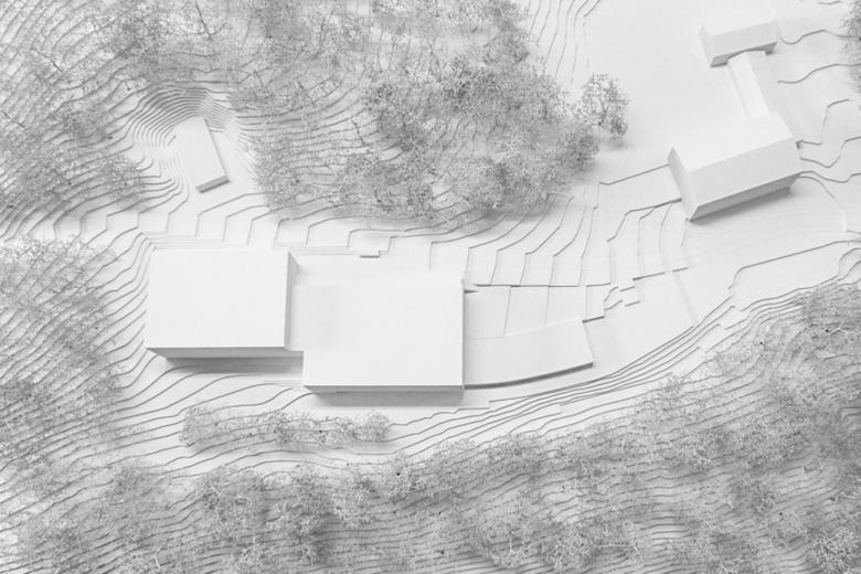 Der einfache und klare Kubus der bestehenden Sporthalle wird durch einen volumetrisch vergleichbaren Gebäudekörper ergänzt. Dank eines horizontalen wie vertikalen Versatzes der Gebäudekörper kann sich die beeindruckend grosse Gesamtkomposition harmonisch in die Geländekammer einfügen. Die feingegliederte Holzfassade des Neubaus harmoniert mit der Holzverkleidung der bestehenden Anlage und passt sich unaufgeregt in die Idylle der Waldlichtung ein.