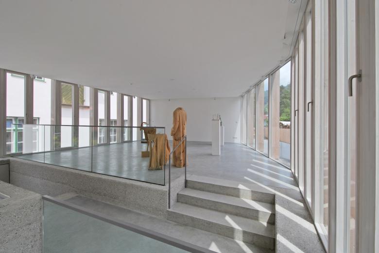 Vier nebeneinander angeordnete große Flügeltüren öffnen sich zum Vorbereich der Schnitzschule und geben, integriert in die transparente Fassade, den Blick auf die grandiose Landschaft von Oberammergau frei. Terrassierte Ebenen mit verbindenden Stufen definieren den Weg des Besuchers durch die Ausstellung. Die differenzierte Treppenanlage wird Teil des Ausstellungskonzepts und bietet verschiedenartige Möglichkeiten zur Ausstellungsgestaltung. Nordseitig, in unmittelbarer Nähe zum tieferliegenden Anlieferhof, befindet sich ein im Sockelbereich integrierter Werkraum zur Holzbearbeitung, sowie ein Übergang zum Bestandsgebäude unter dem Geländeniveau.