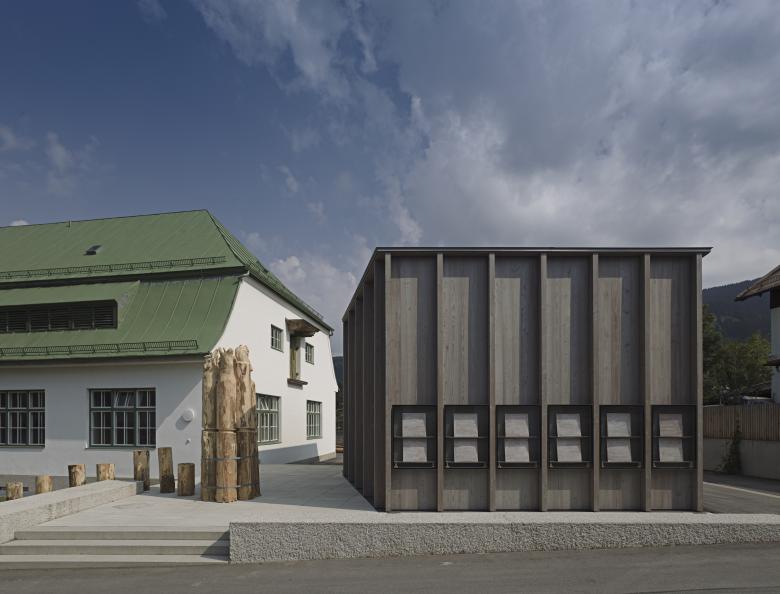 Ein Miteinander von massiven und hölzernen Bauten prägt das unmittelbare Umfeld der Schnitzschule. In Wechselwirkung zum denkmalgeschützten Hauptgebäude ist die Hülle der neuen Ausstellung als leichte Holzstruktur errichtet. Die polygonale Form reagiert auf die örtlichen Gegebenheiten und passt den Baukörper in die Umgebung ein. Das ruhige Erscheinungsbild lässt das Hauptgebäude weiterhin für sich wirken. Die regionale Tradition des Holzbaus sowie der Umgang mit dem Werkstoff Holz in der Schnitzschule wird im neuen Ausstellungsbau gegenwärtig.