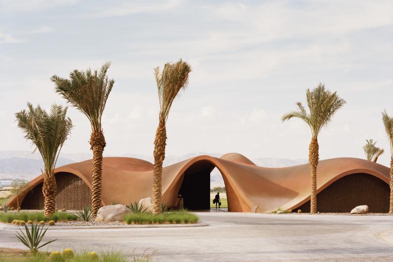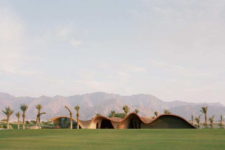 Mit seiner eindrucksvollen architektonischen Form fängt das Ayla Golf Clubhaus die elementare Schönheit der wellenförmigen Wüstenlandschaft ein. Roh, kraftvoll und unverziert vermittelt die Architektur ein tiefes Gefühl für den Ort.