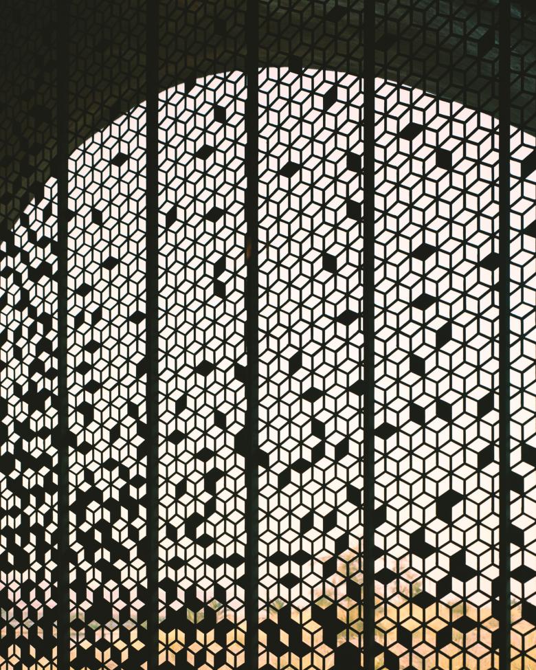 Eine dynamische Betonschale legt sich über die Funktionsbereiche und umhüllt das Innere mit einer durchgehenden Oberfläche. Sie wurde mit Erde vom Bauplatz hergestellt und von einem Künstler aus Aqaba mit lokalen Mineralien und Pigmenten eingefärbt. Die Öffnungen wurden so gestaltet, dass sie die Meeresbrise einfangen, während das Sonnenlicht durch gelochte Cortenstahl-Elemente gefiltert wird – ähnlich der traditionellen arabischen Mashrabiya. Jordanische Muster inspirierten die dreieckigen Öffnungen der Screens, und die Farben der umliegenden Berge spiegeln sich im Beton und den rostigen Metallen wider.