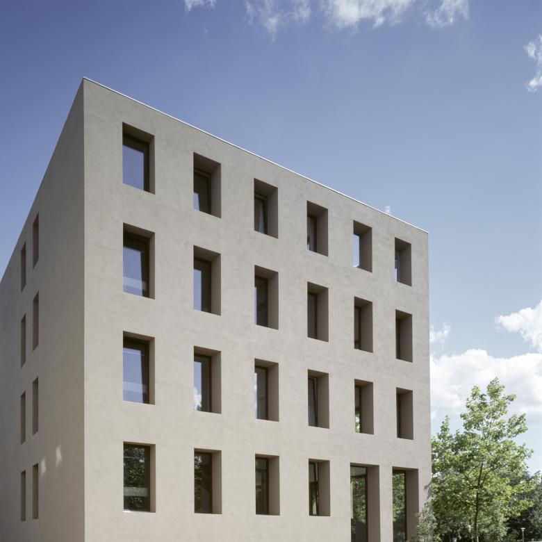 Die Außenwände, monolithisch mit Ziegelsteinen ohne zusätzliche Dämmschichten errichtet, sind außen und innen mit einem Kalkputz versehen. Die Beschichtung der Fassade ist mit einer warmtonigen Reinsilikatfarbe erfolgt, die bei hoher Farbbrillianz und Lebendigkeit eine Gebäudealterung in Würde zulässt. Der Verzicht auf Sohlbänke und die Lage der Fenster auf der Wandinnenseite führt zu einer archetypischen und skulpturalen Gebäudeerscheinung mit klaren Licht- Schatten- Wirkungen. Die großen Raumhöhen lassen geringere Fensterflächen bei hoher Tageslichtqualität zu, da das Tageslicht tief in die Innenräume fällt. Der somit hohe Anteil an Speichermasse gewährleistet ein angenehmes Raumklima.
