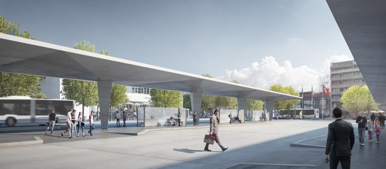 Ein offener Platz zwischen Rondelle, Derby und Stadtsaal markiert Treffpunkt und Drehscheibe am östlichen Bereich des Bahnhofplatzes. Hier laufen die wichtigen Fuss- und Velo-Verbindungen zusammen und die meisten Reisenden kommen an. Auf Blickhöhe wird der Platz bereinigt Dies schafft Übersicht und Sicherheit. Im Randbereich bespielen locker platzierte Baumgruppen den Platz und bilden damit einen Gegensatz zu den regelmässigen Baumreihen der zulaufenden Strassenräume, insbesondere der neu entwickelten Allee auf der Oberen Bahnhofstrasse. Diese führt direkt in die Wiler Innerstadt. Gegen Westen folgt das elegant wirkende, zentrale Dach des Busbahnhofs, welches zu den Umsteigemöglichkeiten auf Taxi, Bus und Frauenfeld-Wil-Bahn überleitet. Der durchgehende Ortbetonbelag markiert den stärker befahrenen Bereich des Busbahnhofs mit den hohen Haltekanten und setzt sich von den umgebenden Asphaltflächen ab.