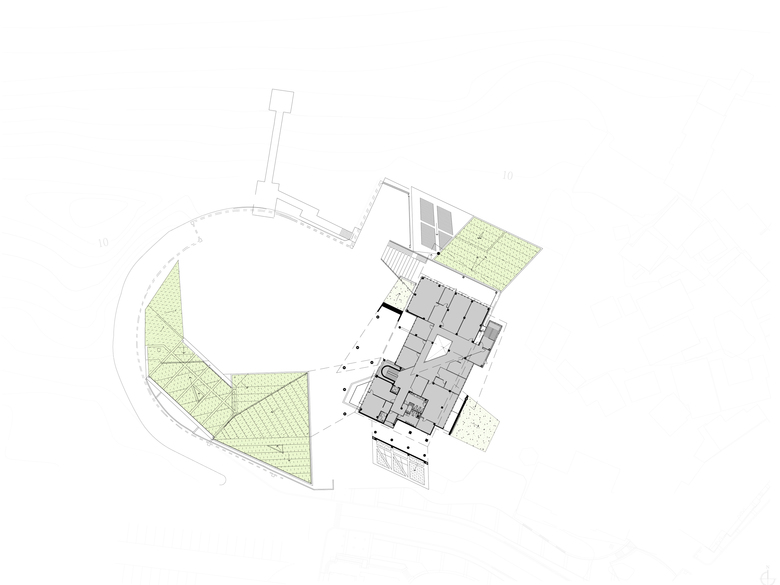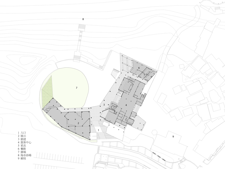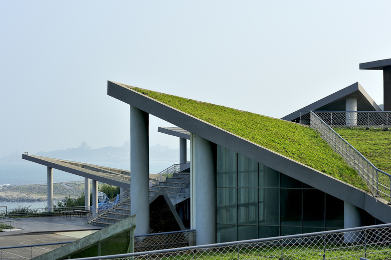 The design of Bai Sha Wan Beach and Visitor Centre responses to the strong wind and sand in winter and the intense sunlight in summer. The architecture works with the topography and changes the traditional binary relationship between landscape and architecture. It is expected that the architecture could act like trees and rocks which integrate with the landscape. The existing building and the new visitor center are connected by slanted slabs, and visitors could walk along the landscape terrain to the grassland on the rooftop. These folded slabs also reflect the indoor activities, the changing shadow profile as well as the waterfront landscape. The L-shaped building mass is arranged according to the contour and the retaining walls, creating an open plaza in front facing the sea. The undulating rooftop not only integrated with the topography, the various-sized tilted slabs at the north also brings natural sunlight into the interior spaces. These large pieces of roof slabs also provide shading for the naturally ventilated semi-outdoor spaces where visitors’ activities take place. Walking from the carpark behind, across a framed view entrance, and passing the shaded walkway along the building to the beach in front, visitors can experience a fascinating scenery.
