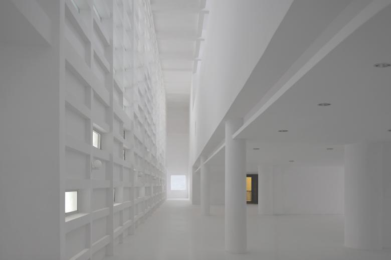 The complex layout takes inspiration from the local multi-patio traditional scheme, called ‘yard inside yard’, where the central gallery cube is surrounded by a U shape outer layer of buildings. The distinct volumes of the three main buildings have been designed to rationalize the functions, to create an easier orientation and a more efficient resources’ allocation. The white lower volumes include all the public areas (community center, counseling and help center, exhibition hall…) while the dark high-rise building provides the internal workspace (training center, offices, archive…).