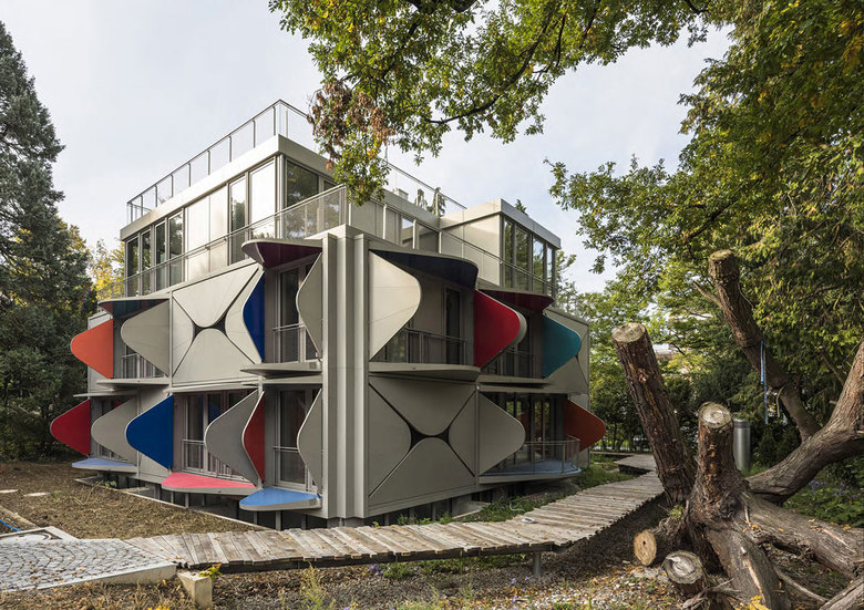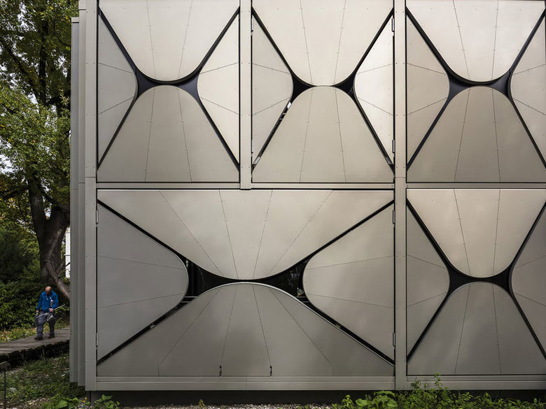 Das aussergewöhnliche Erscheinungsbild des Gebäudes wird massgeblich durch das sogenannte „Ballet Mécanique“ bestimmt, eine vor der Verglasung installierte zweite Fassadenebene mit beweglichen Elementen, die als vorgehängte Stahlleichtbaukonstruktion mit Hydraulikantrieben ausgeführt wurde. Balkonplatten, Vordächer, Fensterläden wie auch die erforderlichen Geländer sind Teil der Mechanisierung des „Ballets“. Den Nutzerbedürfnissen folgend können diese Elemente wahlweise geschlossen sein und teilweise oder vollständig geöffnet werden, bis die Zugänglichkeit der Balkone erreicht ist.