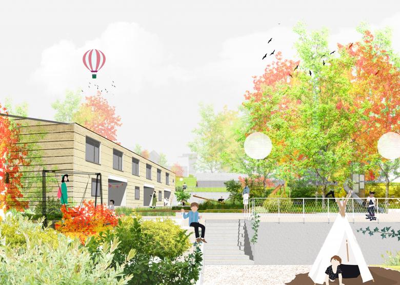 Das Gebäude Balu für die drei Kindergärten sowie die Tagesbetreuung berücksichtigt das Potential der Umgebung und ist nahe an die Natur gebunden. Im Zentrum steht dabei das Tanneichbach-Tobel mit seiner geschützten Gehölzgruppe. Die neue Topografie erschafft wichtige Zonierungen für die Aussenraumnutzung. Die beiden Gebäudeebenen können über den Schubertweg entlang der Längsfassade erschlossen werden.