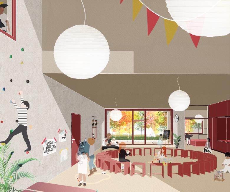 Die Kindergärten im Erdgeschoss spiegeln durch grosse Räume für die Gesamtklasse die Alltagslogik der Schule. Gleichzeitig werden durch Nischen Möglichkeiten für individuellen Rückzug geschaffen. Mit einem Gefüge aus diversen Räumen wird dieses Potential ausgeschöpft, ohne die Bespielbarkeit des Grundrisses einzuschränken.