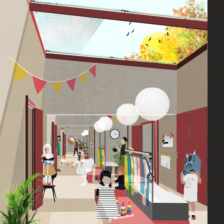 Die Tagesbetreuung im Obergeschoss schafft anhand von kleineren Räumen optimale Bedingungen für eine familienergänzende Versorgung. Sie entwickelt sich von ruhigen Gruppenräumen über offene Begegnungszonen bis hin zu lauten Bewegungsräumen. Die Raumkammerung von verschiedenen Raumtypen optimiert die betrieblichen Abläufe und kann dadurch als eine sichere und lebendige Welt erlebt werden.