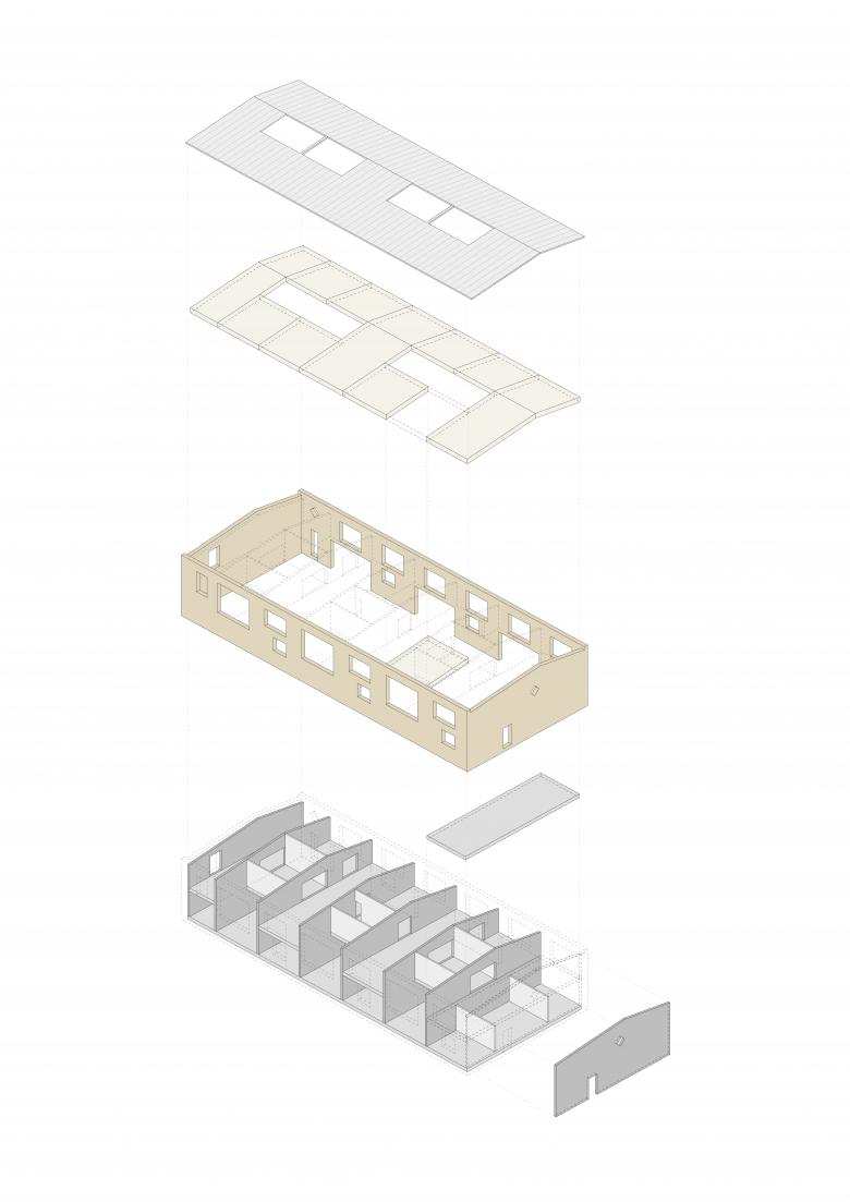 Für die Aussenhülle wird das organische und lebendige Material Lehm verwendet, dessen steinerne Masse an die Nachbarschaft anbindet. Die Haptik und Farbe hingegen schaffen den Bezug zum Naturraum. Im Innenraum entsteht durch eine Schottenstruktur ein offenes Raumgefüge, wobei die tragenden Elemente unbehandelt bleiben. Die nichttragenden Elemente werden passend zur Aussenhülle mit Lehmputz versehen. Die Schreinerarbeiten werden – als Kontrast zu den natürlichen Farbtönen der Umgebung und Konstruktion – rot eingefärbt und stärken den warmen Ausdruck des Gebäudes.
