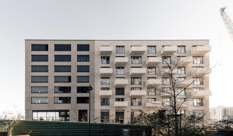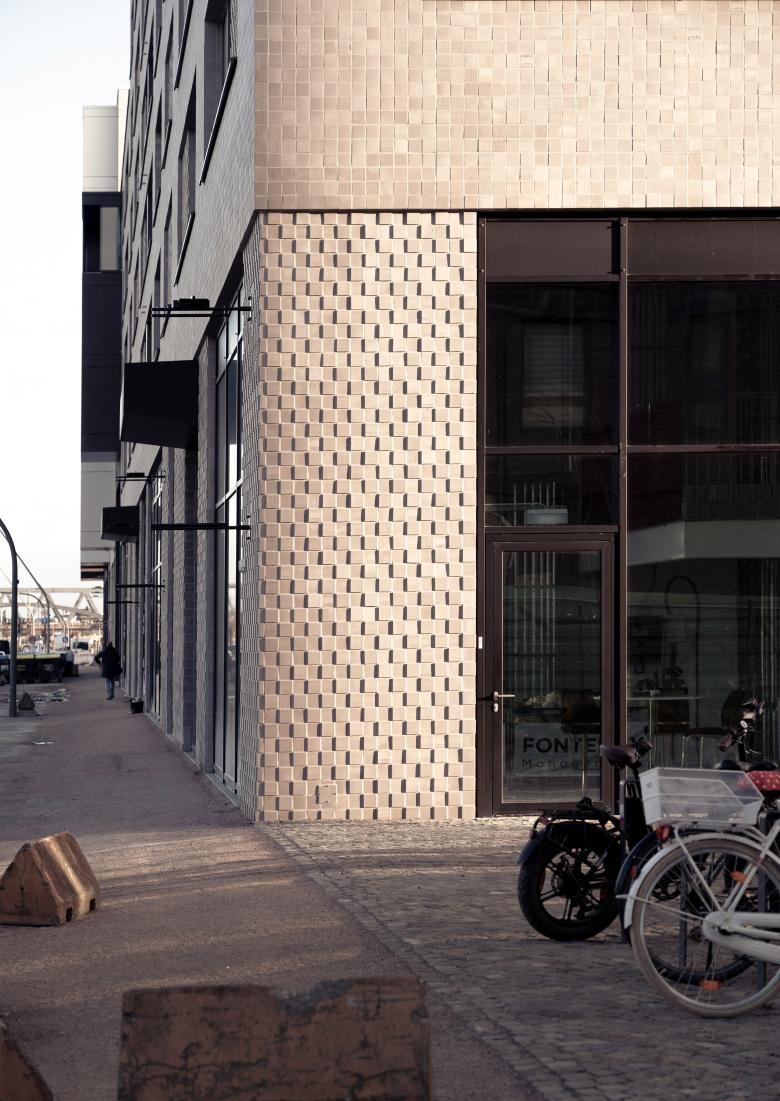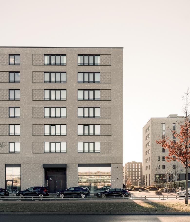 Das Ergebnis eines hochbaulichen Realisierungswettbewerbs bildet die Grundlage für die Blockrandbebauung im östlichen Teil der HafenCity Hamburg. In doppelter Wasserlage an der Elbe liegt das 24 ha große Quartier Neuhavn, auf dem unterschiedliche Wohnungstypologien, Büro- und Gastronomieflächen realisiert werden. Das städtebauliche Umfeld ist geprägt durch die Wasserlage sowie die Nähe zum Liselotte-von-Rantzau-Park und den U-Bahnhöfen HafenCity Universität und Elbbrücken. Das von DFZ realisierte Baufeld 84a besteht aus insgesamt drei Gebäudeteilen: Das siebengeschossige Haus 1 liegt orthogonal zwischen Hafenbecken und Bahntrasse. Neben 32 frei finanzierten Wohnungen befinden sich hier zwei zum Wasser ausgerichtete Townhouses sowie die Räumlichkeiten der Loki Schmidt Stiftung. Letztere beherbergt neben den Büroräumen, eine Galerieebene sowie eine Ausstellungsfläche im Warftgeschoss mit Zugang zur Uferpromenade. In den parallel zur Versmannstraße ausgerichteten Baukörpern (Haus 2+3) befinden sich neben den 62 geförderten Wohnungen, Büroflächen sowie ein Café im Erdgeschoss. Das äußere Erscheinungsbild des Ensembles wird durch eine Riemchenfassade im Sonderformat geprägt. Die Fassade von Haus 1 ist mit einem schmalen Klinkerriemchen im Hochformat versehen, das die vertikale Ausrichtung des Gebäudes betont. Bei den Häusern 2+3 kommt ein quadratisches Riemchenformat zum Einsatz, das im Erdgeschoss und im Bereich der Fensterflächen durch vor- und rückspringende Steinreihen akzentuiert wird. In Kombination mit den dunklen Metallbauteilen und den Glasflächen tritt der helle Klinker deutlich in den Vordergrund. Das Gesamtkonzept verbindet klare architektonische Stringenz mit einer differenzierten Materialwahl und Fassadengestaltung, die die unterschiedlichen Nutzungen ablesbar macht und das Erscheinungsbild prägt. Die Häuser 2+3 werden unter Berücksichtigung der Förderrichtlinien der IFB realisiert. Das Projekt ist mit dem HafenCity Umweltzeichen Platin ausgezeichnet.